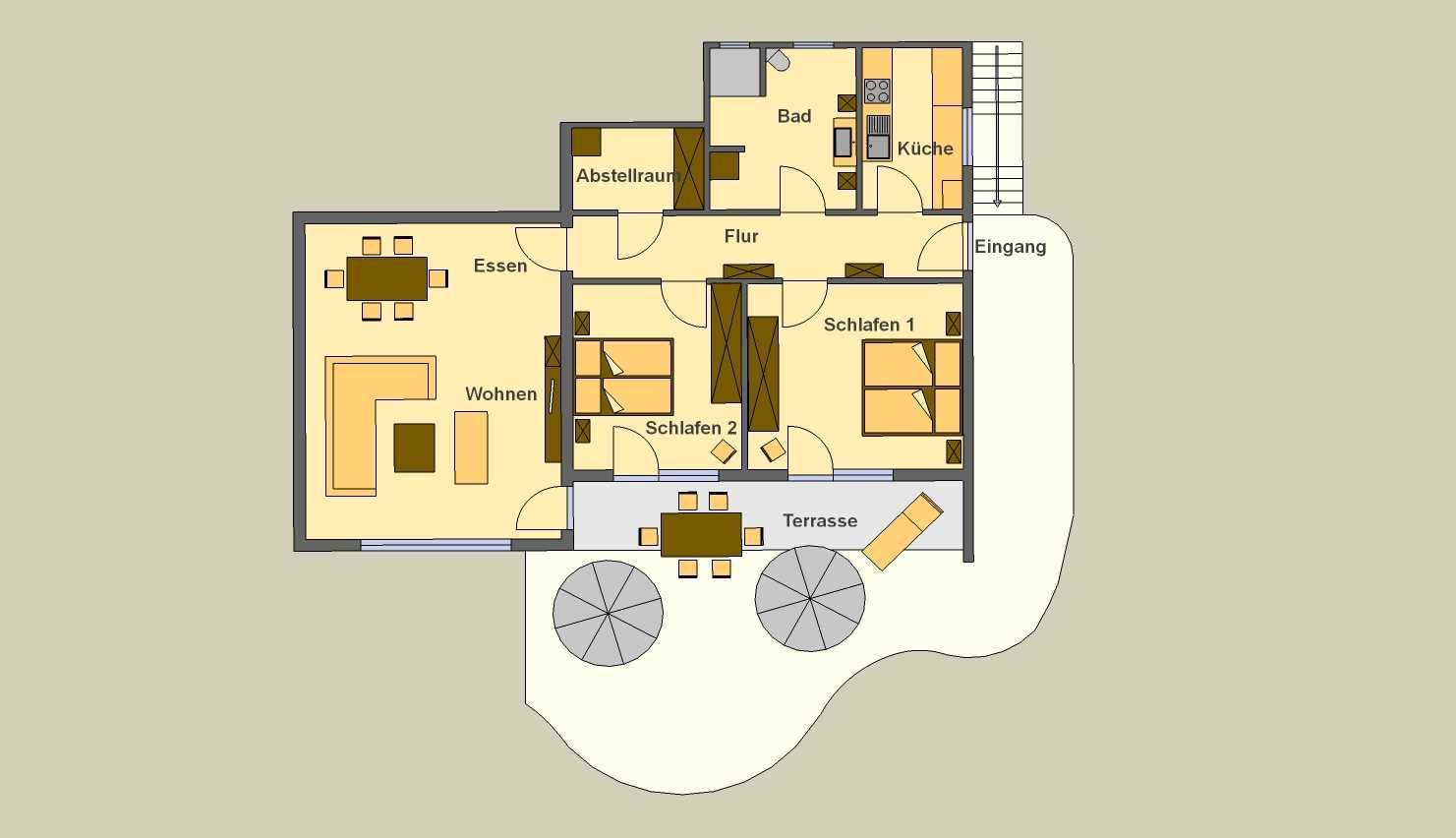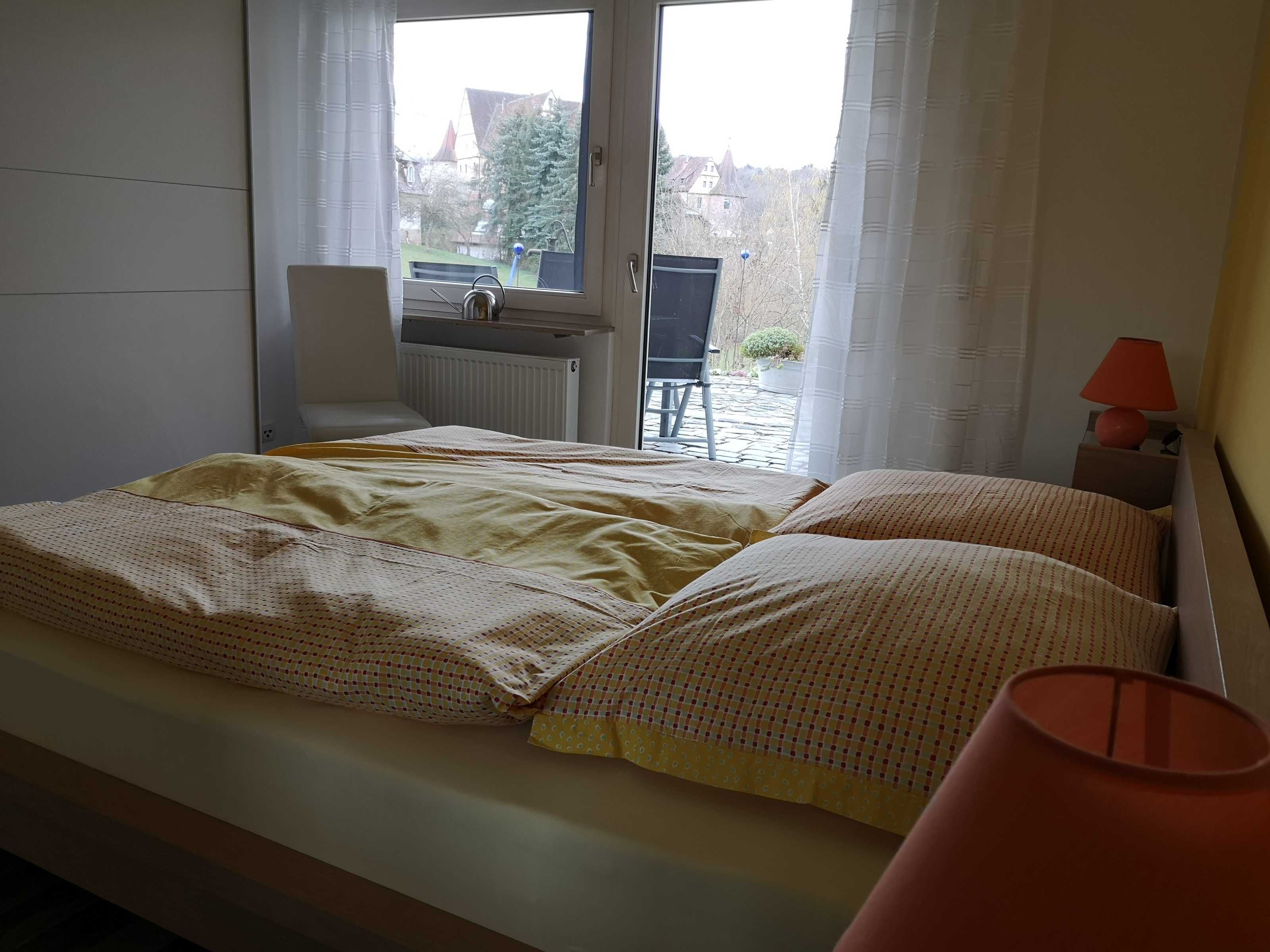 Unsere Ferienwohnung liegt im Untergeschoß des Hauses und verfügt über 3 Zimmer (2 Schlafzimmer, Wohnzimmer), Küche, Duschbad und Abstellraum. Alle Wohnräume haben direkten Zugang zur großen, sonnigen Süd-West-Terrasse. Die Schlafzimmer können verdunkelt werden. Alle Wohnräume verfügen über Fliegengitter an Fenstern oder Türen. Sie haben einen wunderbaren Ausblick auf Schloss Wiesenthau. In Schlafzimmer 1 - blau - steht Ihnen ein gerade neu angeschafftes Bett 1,80 x 2 Meter, In Schlafzimmer 2 - gelb -ein Bett mit 1,60 x 2 Meter zur Verfügung. Kleinkinderausstattung (Bett und Hochstuhl) auf Anfrage. Die Wohnung kann maximal 4 Erwachsene und ein Kleinkind beherbergen.