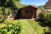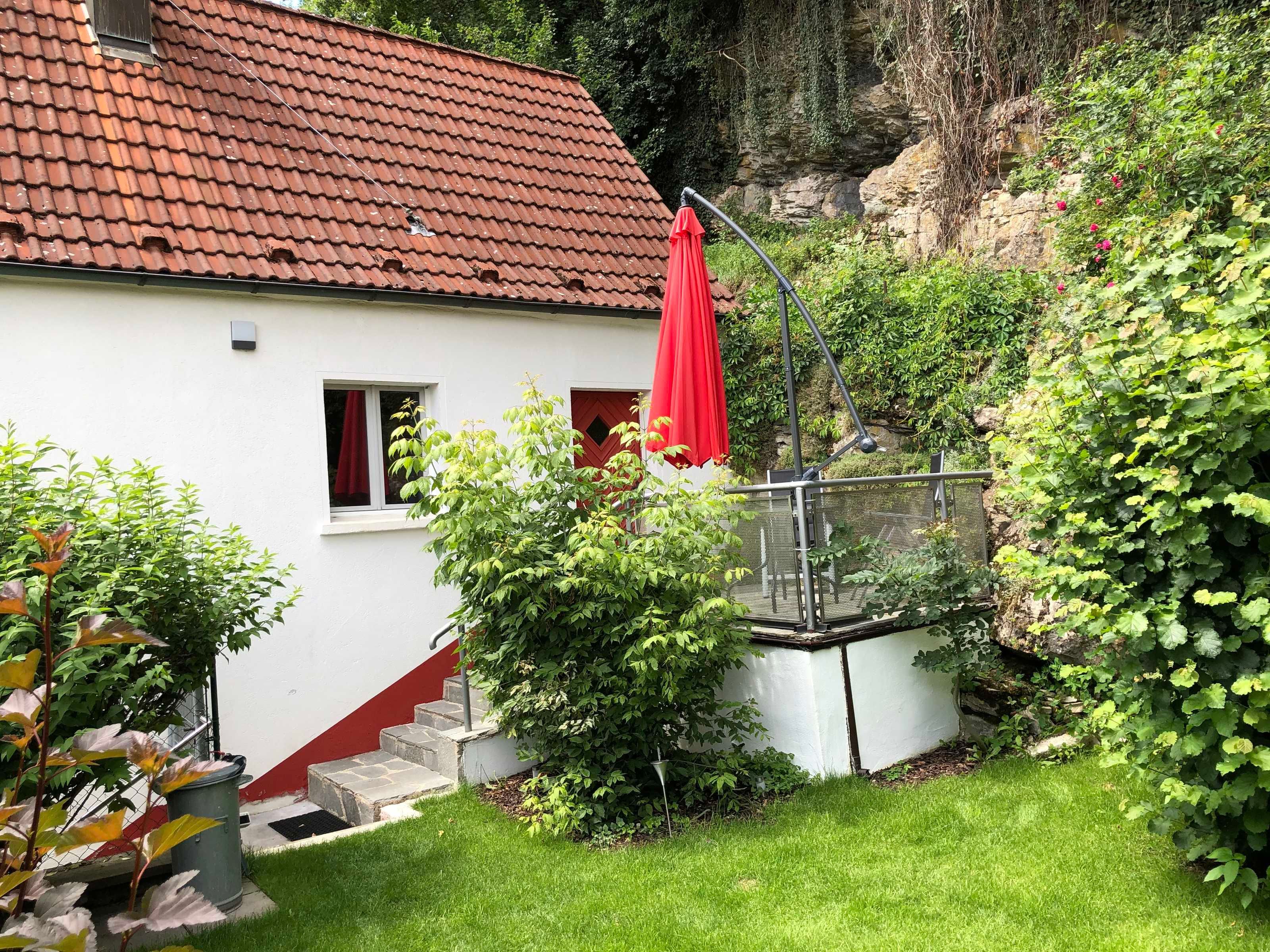 Terrasse Südhang, Gartentisch mit Gartenstühlen und Sonnenschirm, Liegewiese mit Relaxliege und Gartenliege.