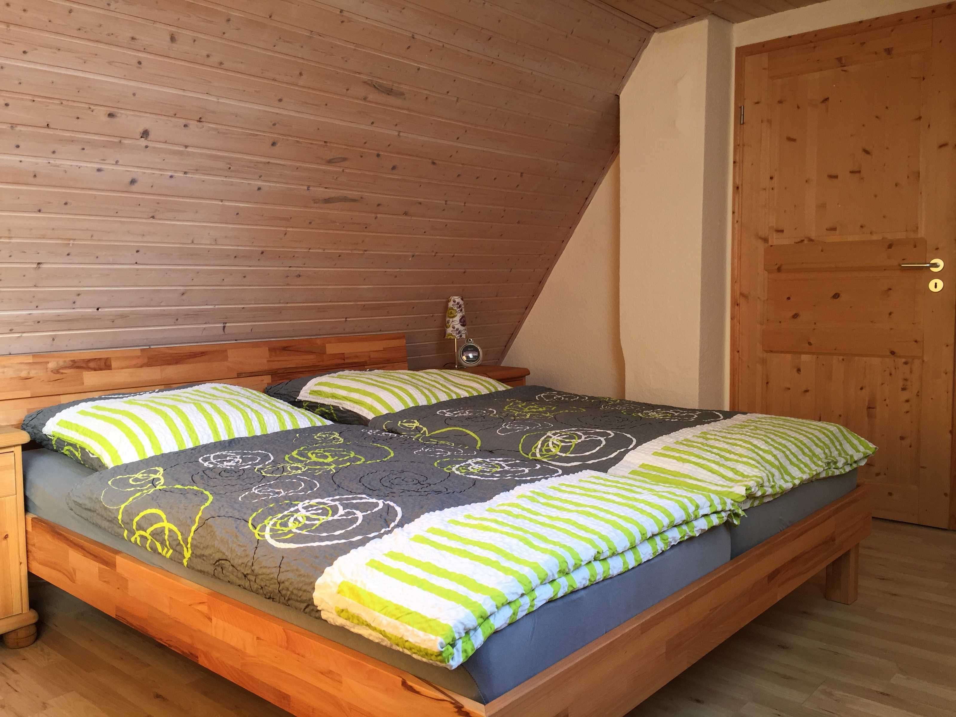 Die beiden Schlafzimmer finden Sie im 1.Obergeschoss. Ein Schlafzimmer ist ein Durchgangszimmer zum anderen Schlafzimmer.