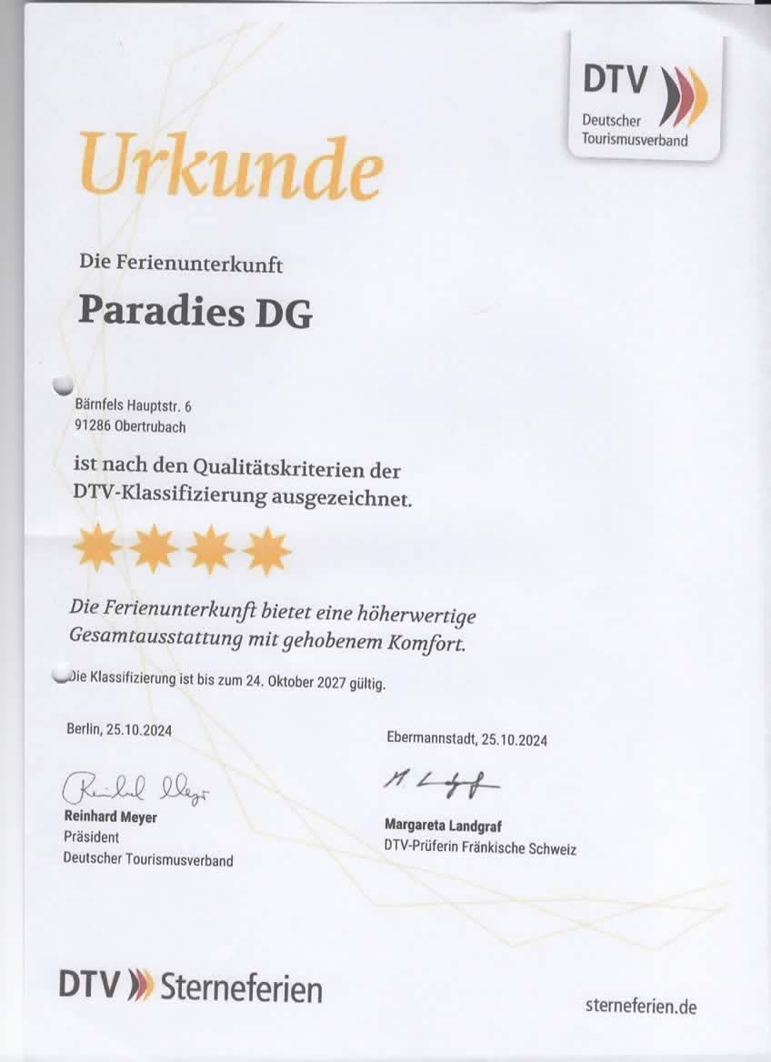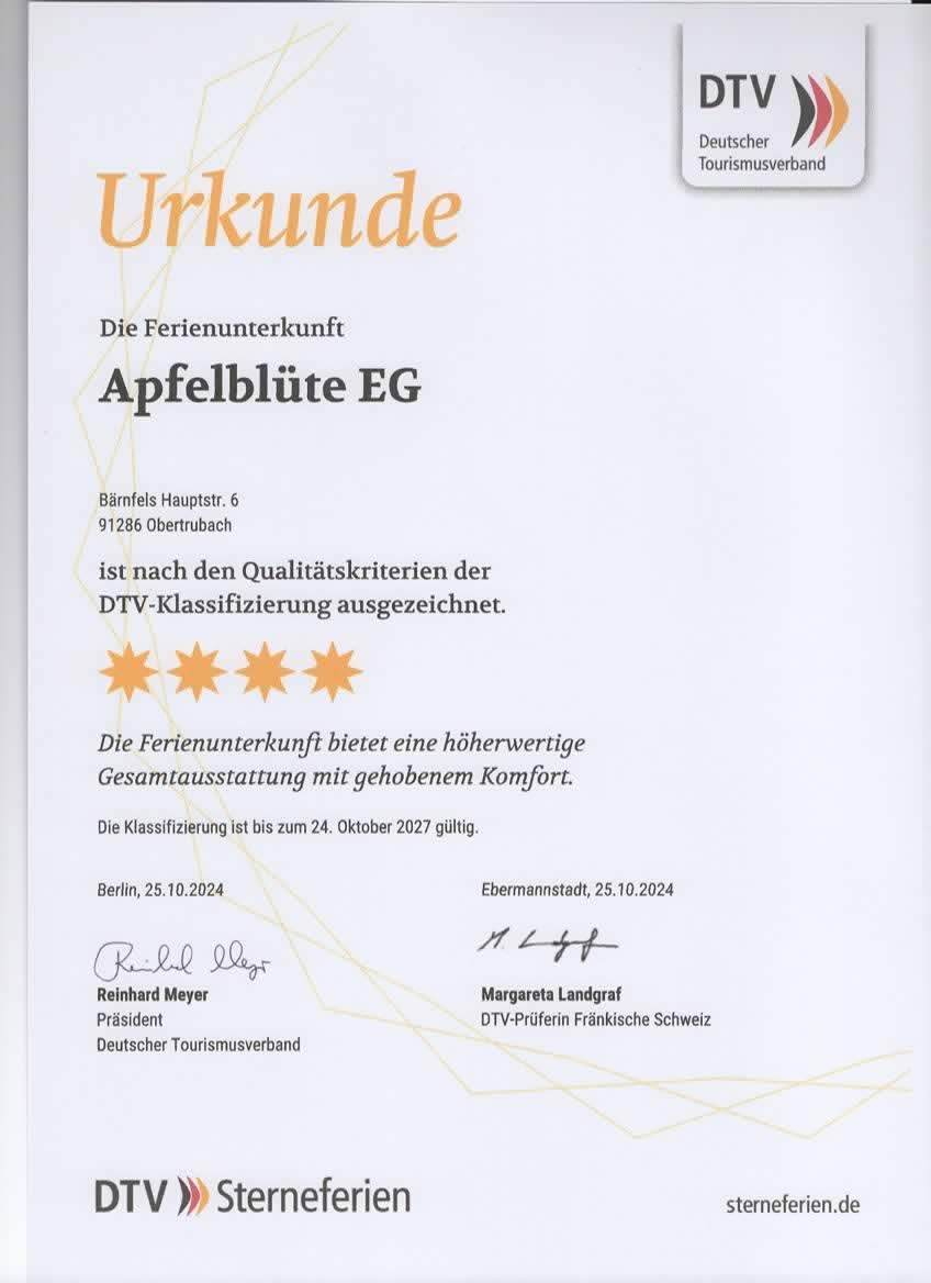 Die Feriewohnungen Apfelblüte und Paradies wurden vom Deutschen Tourismusverband 2024 wieder mit 4 Sternen klassifiziert.