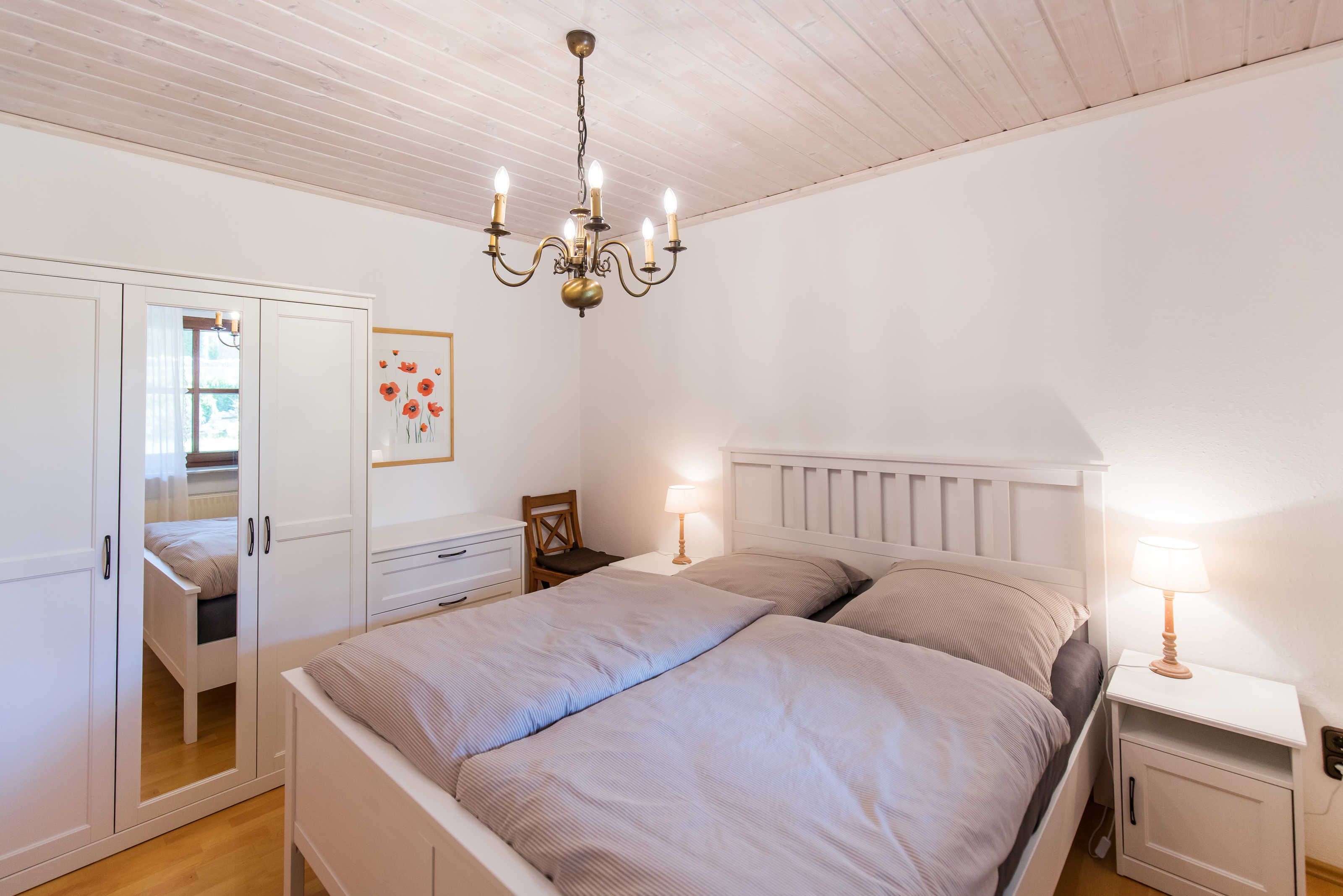 Das Schlafzimmer rechts, 11,7 qm groß, ist mit einem Doppelbett ausgestattet, 1,60x2 m +Safe