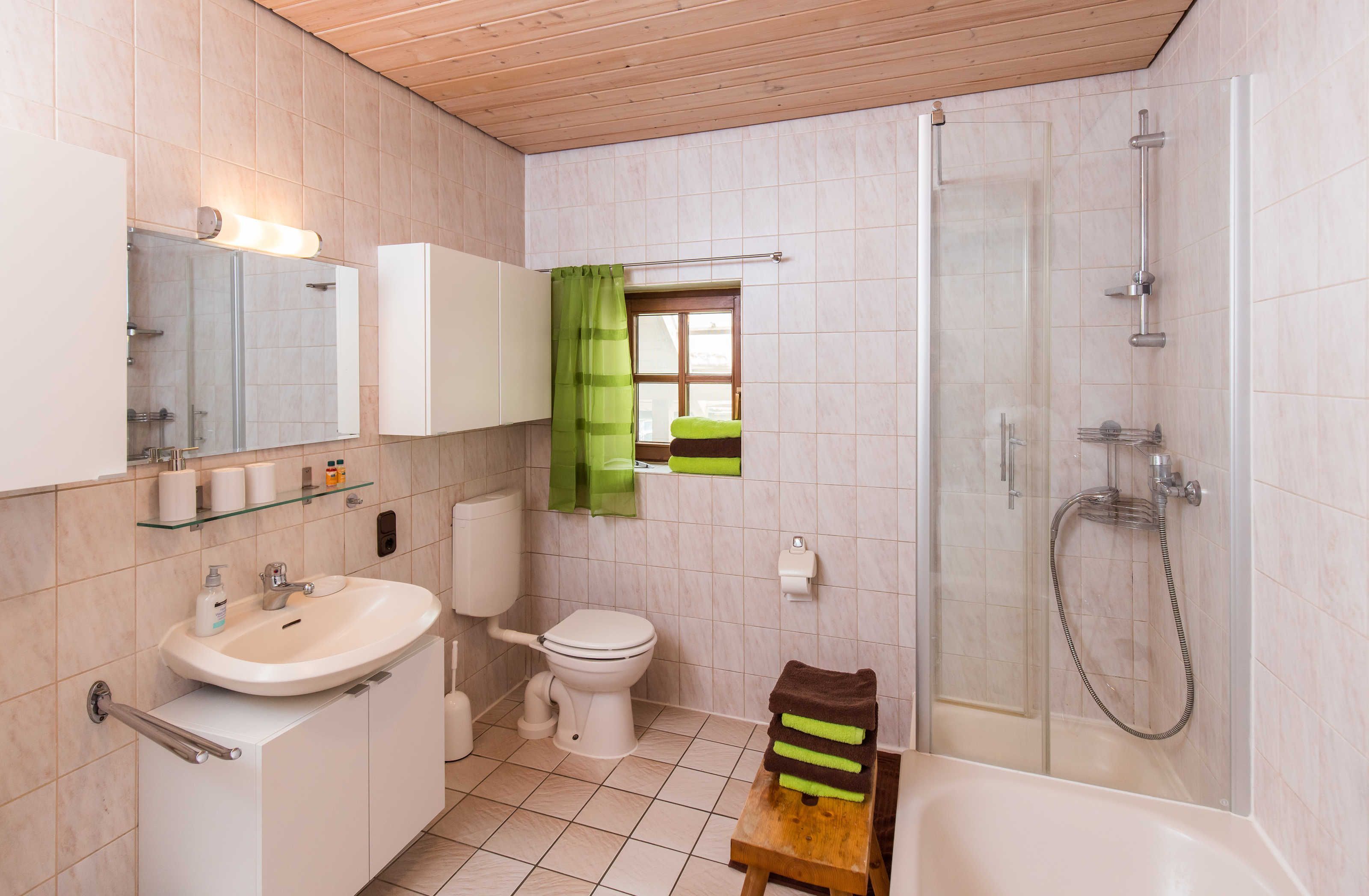 Das Badezimmer, 7,7 qm finden Badewanne, Dusche, WC, Föhn und Bademäntel, Waschmaschine und Trockner Platz.