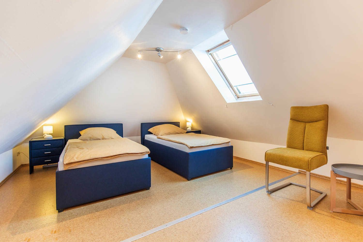 und ein Schlafzimmer ebenfalls 10,7 qm. mit zwei Einzelbetten (1mx2m), Flachbild-TV, Sitzecke, Leselampe und Ablagen, jeweils Korkböden.