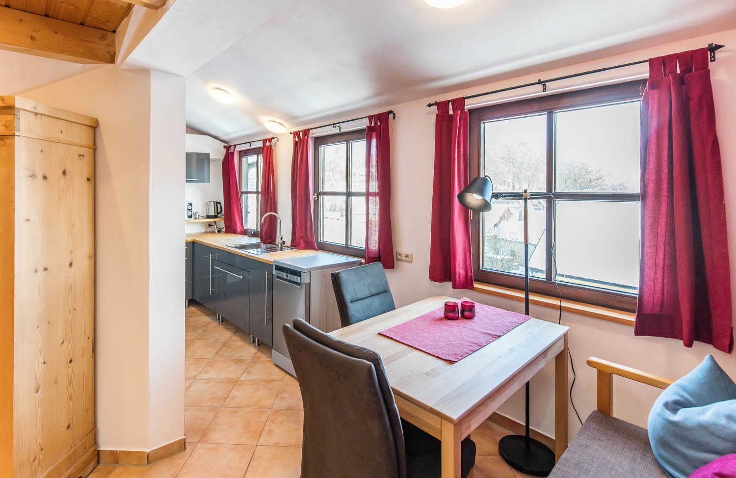 Die wohnliche Küche mit Fliesenboden und Fußbodenheizung, Kühl-/Gefrierschrank, Spülmaschine, Kaffeemaschine, Stabmixer, Toaster, Wasserkocher, Raqulett u.a. und einem kleinem Essbereich bietet sie alles für eine unabhänigige Selbstverpflegung.