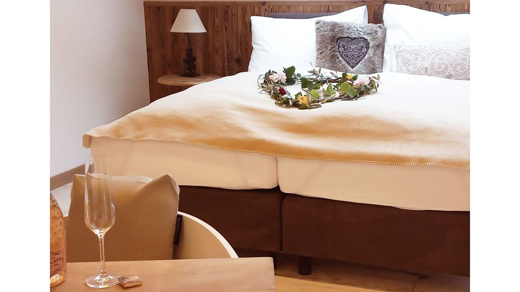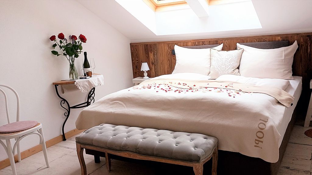 Kuschelzeit am Roiderhof – unsere mit Liebe eingerichteten Wohlfühlzimmer laden Dich ein, die Seele baumeln zu lassen, Deinem eigenen persönlichen Wohlfühlrhythmus nachzugehen, Dich zu entspannen – bei einem Erholungsbad oder einem guten Glas Wein auf der Dachterrasse. Auf Wunsch dekorieren wir  auch gerne  für Honeymoon- und Romantik Paare. Die Kleinen bleiben diesmal daheim –  am Roiderhof haben Eltern „Kinderfrei“  –  eben Kuschelzeit. Bewusst Zeit genießen – jedoch  nicht nur für Paare – ideal auch für Sportkollegen und Seminargäste – ein unkompliziertes „Freundschaftsfeeling“  können wir gerne, durch einfaches Trennen der Betten, herstellen. Dein persönliches Frühstück wird je nach Wunsch, mit erlesenen Bioprodukten aus Marias Biotreff,  zubereitet und  morgens vor die Tür gebracht.