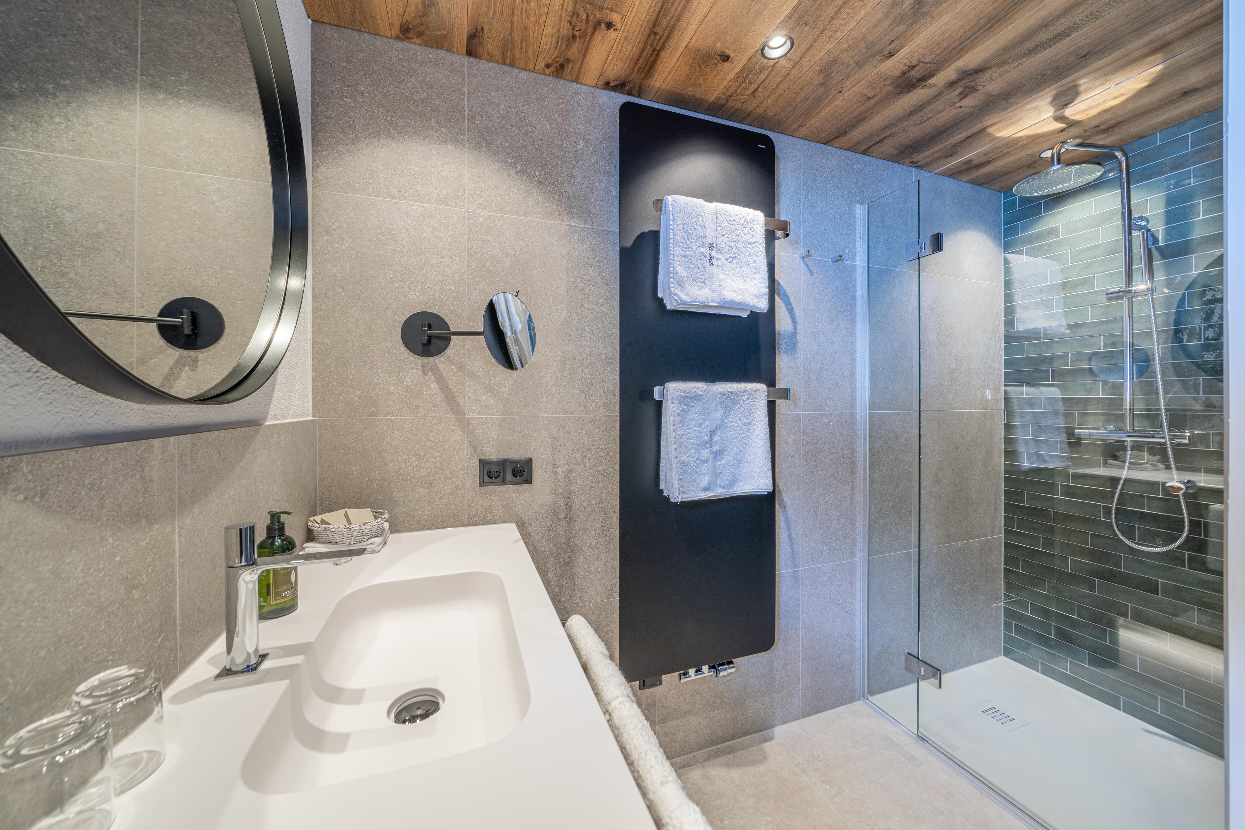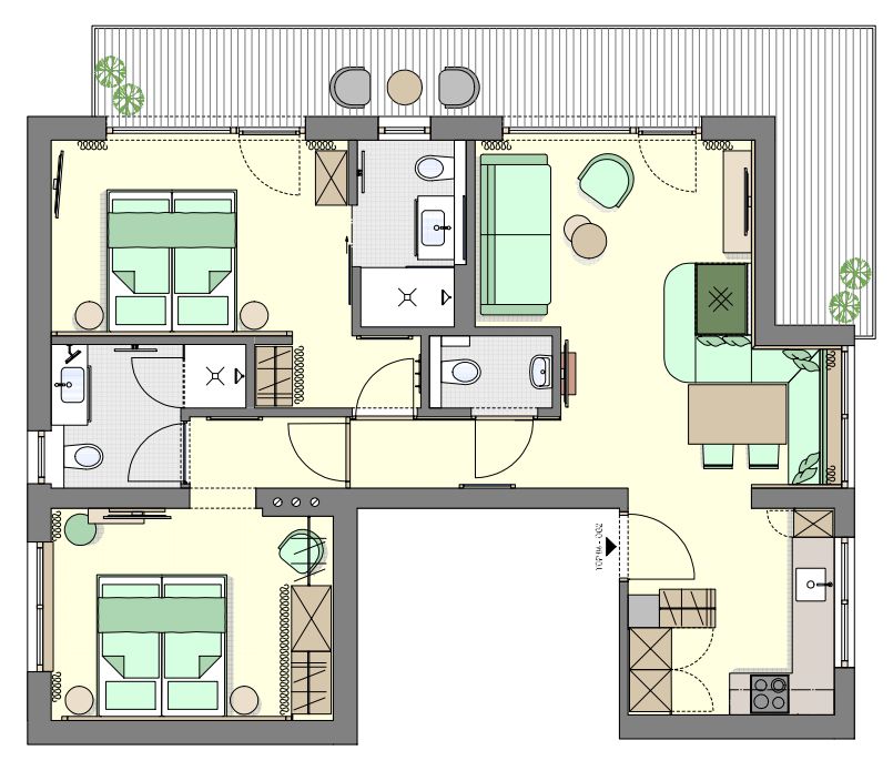 Ausgesprochen schöne Ferienwohnung mit ca. 74 m² für 4-5 Personen: 2 Doppelzimme; 2 Badezimmer (1x Dusche/WC , 1x Badewanne/WC), 1 vollausgestattete offene Wohnküche mit Kachelofen, Schlafsofa für 1 Person und Sitzecke, Kabelfernsehen, Radio, Safe, Cerankochfeld, Kühlschrank, Kaffeemaschine, Mikrowellenherd, Geschirrspüler, Toaster, Wasserkocher etc.. Großer Südbalkon. Nichtraucherwohnung