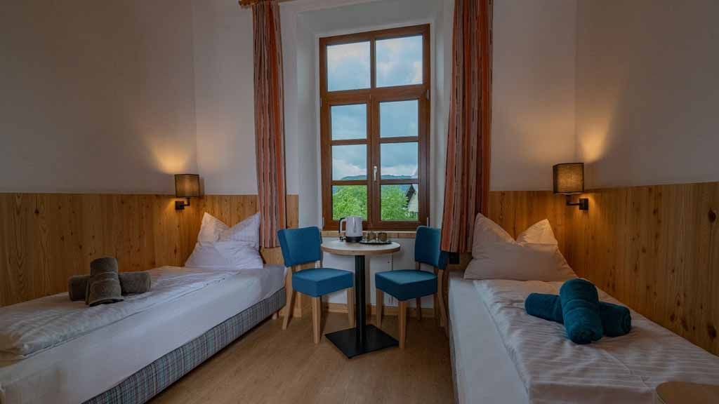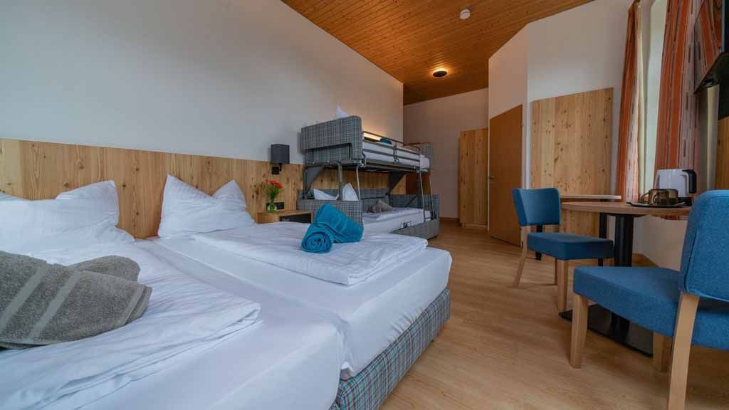 All unsere Familienzimmer 11 befinden sich im 1. Stock unserer Pension. Dieses ist ein sehr helles, freundliches, neu renoviertes Zimmer mit Doppelbett, Sitzgelegenheit und Schlafsofa für 1 Person. In diesem Zimmer kann bei Bedarf ein Gitterbett beigestellt werden. Alle Familienzimmer sind ausgestattet mit Kabel-TV, Wasserkocher und Schranksafe. Das Badezimmer ist mit Dusche, WC und einem Föhn ausgestattet.