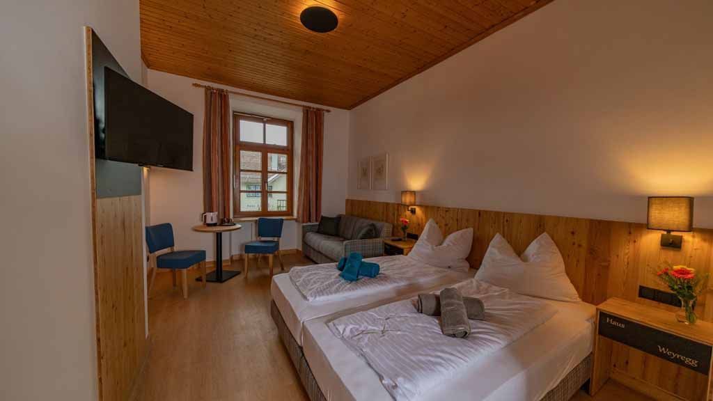Dieses Zimmer ist mit einem Stockbett ausgestattet. Es verfügt über Kabel-Tv, Wasserkocher und einem Schranksafe. Das neu renovierte Badezimmer ist mit Dusche, WC und einem Föhn ausgestattet. Dieses Zimmer lässt sich perfekt als separates Kinderzimmer zu einem Doppelzimmer dazu buchen. Es bietet aber auch Radfahrern, oder Pilgern auf der Durchreise eine gemütliche Bleibe mit Hüttenfeeling.