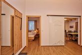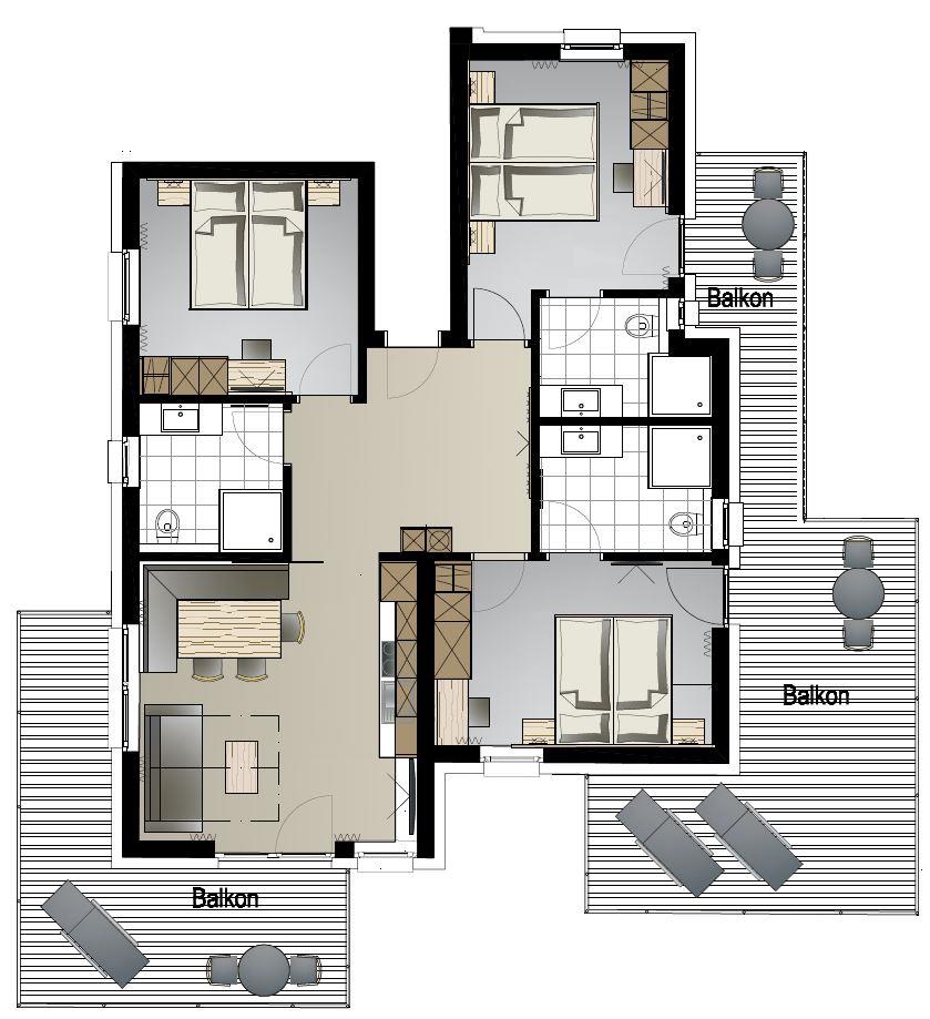 Unser Appartement Penthouse befindet sich in der obersten Etage und umfasst ca. 82 m². Das Herzstück des Appartements ist der große Wohnraum mit voll ausgestatteter Küchenzeile mit Essbereich, Cerankochfeld, Backrohr, Spülmaschine, Kaffeemaschine, Wasserkocher, Mikrowelle uvm., sowie Fernsehecke mit ausziehbarer Couch für 2 weitere Personen. Drei getrennte Schlafzimmer mit TV und drei Badezimmer mit Dusche, WC und Föhn sorgen für ausreichend Privatsphäre. Hohe Decken mit Sichtdachstuhl und zwei Balkone mit Sitz- und Liegemöglichkeit verleihen dem Appartement seinen besonderen Flair.
