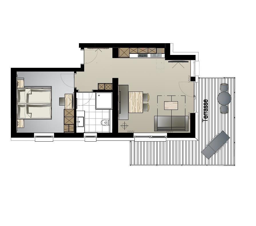 Das Parterre-Appartement mit ca. 42 m² verfügt über einen großzügigen Wohnraum mit voll ausgestatteter Küchenzeile, Esstisch, Cerankochfeld, Backrohr, Spülmaschine, Kaffeemaschine, Wasserkocher, Mikrowelle uvm., sowie über eine Fernsehecke mit ausziehbarer Couch (2 Personen). Ein getrenntes Schlafzimmer mit TV, Badezimmer mit Dusche, Föhn und WC und eine eigene Terrasse/Balkon mit Sitzmöglichkeit und zwei Liegen sorgen für einen erstklassigen Wohnkomfort mit Bergblick.