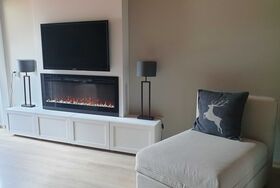 Grosse Wohnzimmer mit gemütliche Sitzgruppe, Schreibtisch, elektrische Kamin und Smart-TV.