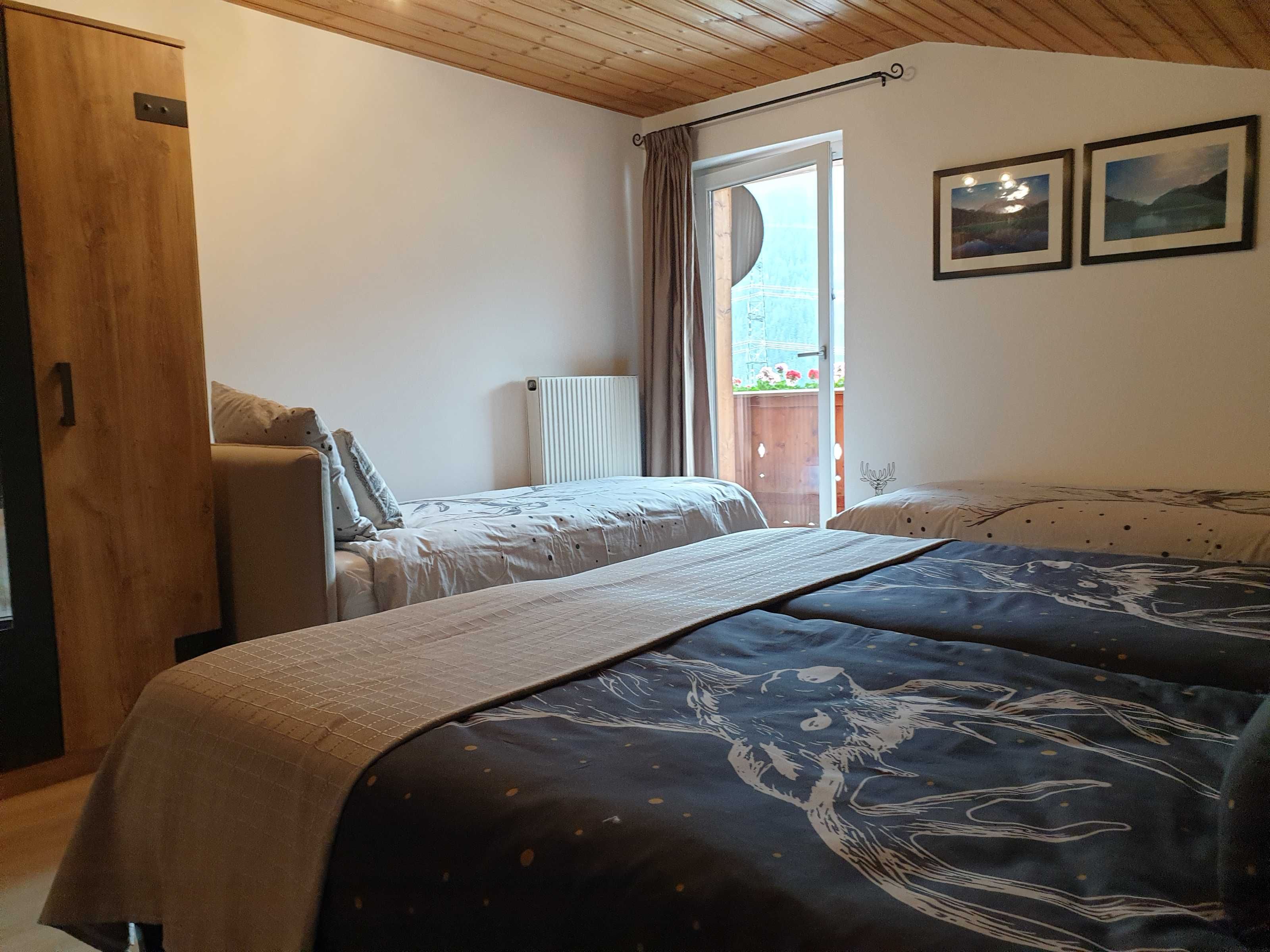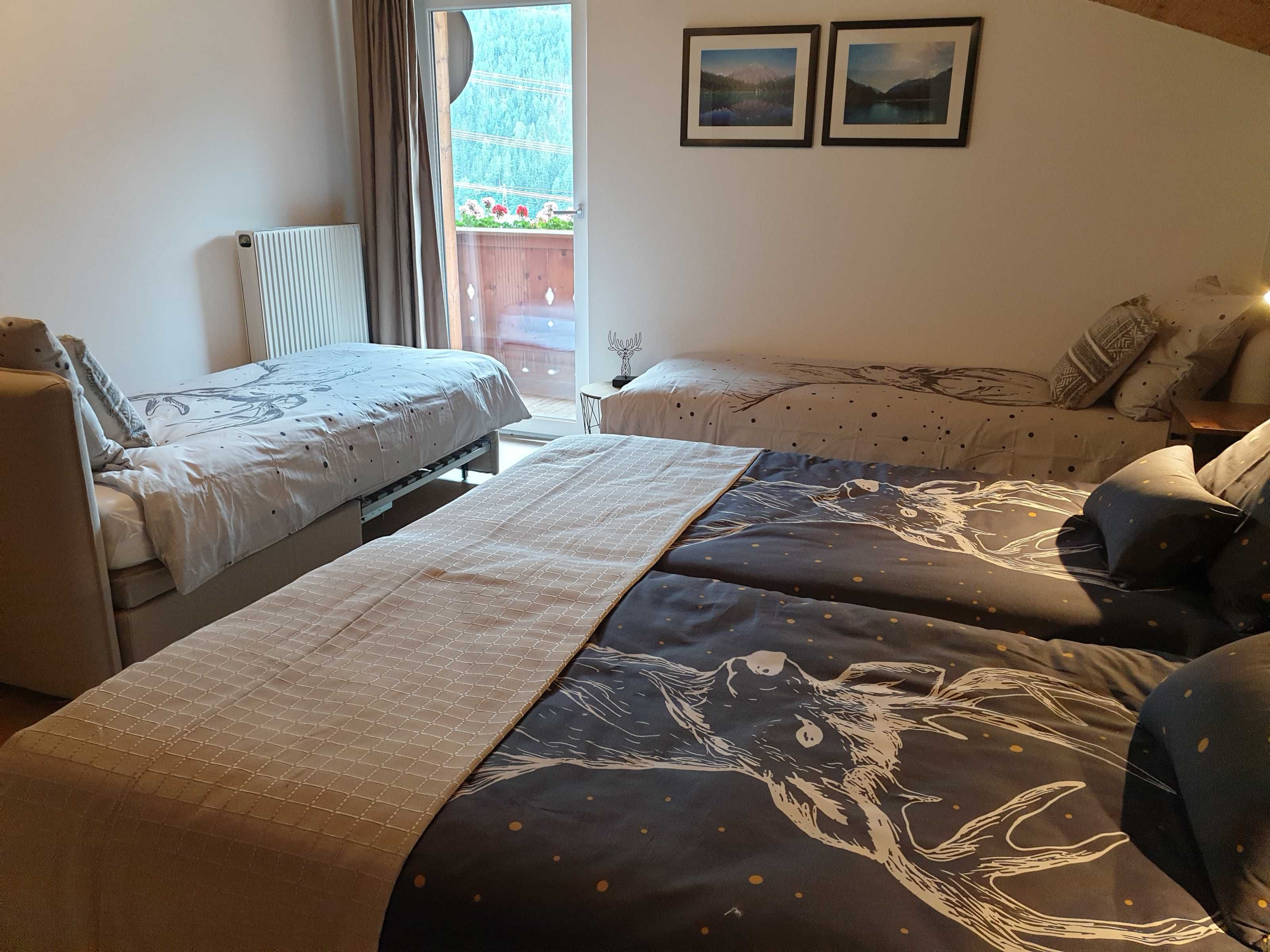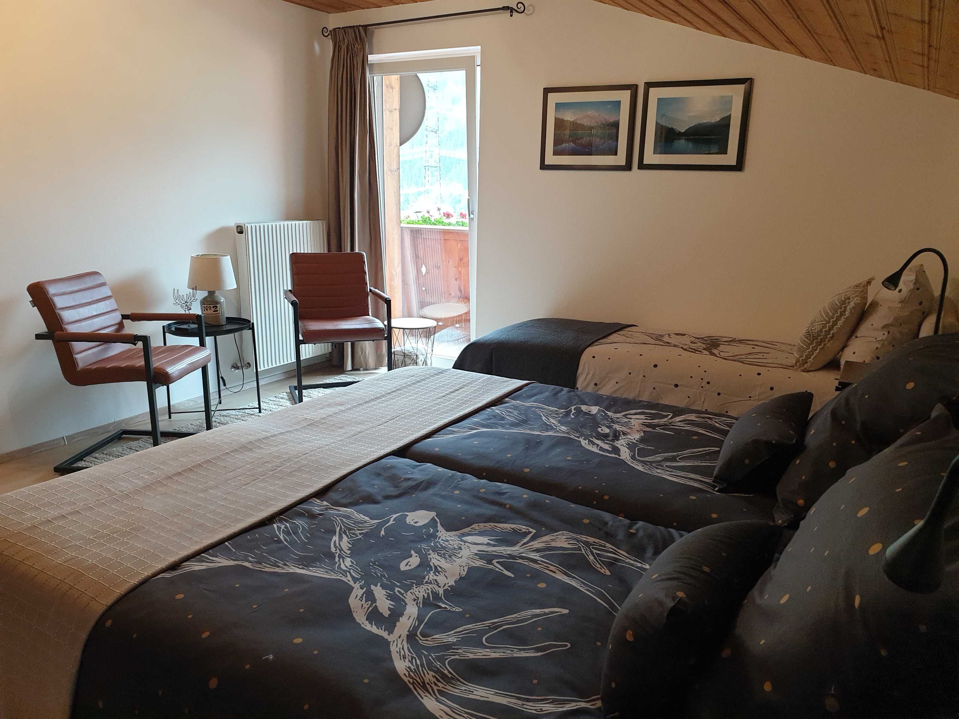 Ferienwohnung ALPENROSE, im zweiten Stock verfügt über zwei geräumige Schlafzimmer, ein grosses Wohnzimmer und eine grosse, separate Küche mit Herd, Backofen, Kühlschrank und Geschirrspüler. Das Ganze ist in einer persönlichen Atmosphäre eingerichtet, damit sich die Gäste wie zu Hause füllen. Balkon und Terrasse mit Gasgrill, beide mit herrlichen Ausblick, runden das Bild ab.