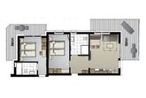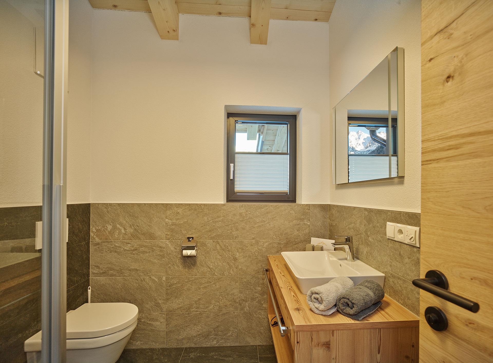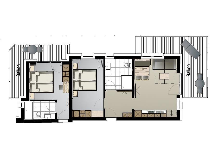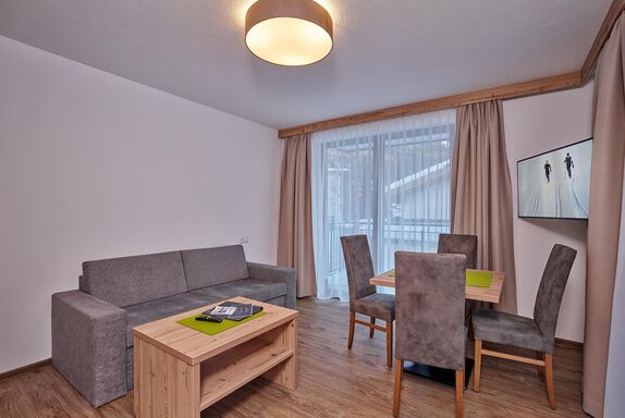 Das zweitgrößte Appartement Top 4 bietet Platz auf 60 m². Herzstück ist der große Wohnraum mit voll ausgestatteter Küchenzeile, Esstisch, Geschirrspüler, Kühlschrank, Backofen, Kaffeemaschine, Mikrowelle, Wasserkocher und Fernsehecke mit ausziehbarer Couch für 2 weitere Personen. Zwei getrennte Schlafzimmer mit TV und zwei Badezimmer mit Dusche, WC und Haarföhn sorgen für ausreichend Privatsphäre. Den Bergblick genießen Sie von den zwei Balkonen mit Sitzmöglichkeit und Liegen.