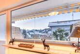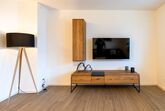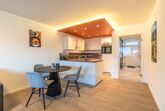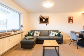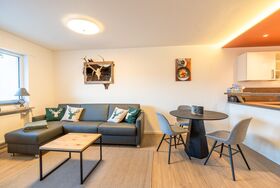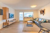 Die Wohnung verfügt über einen großen hellen Wohnraum mit Panoramafenstern, Schlafcouch für 2 Personen, eine hochwertige Küche und eine gemütliche Essgruppe.