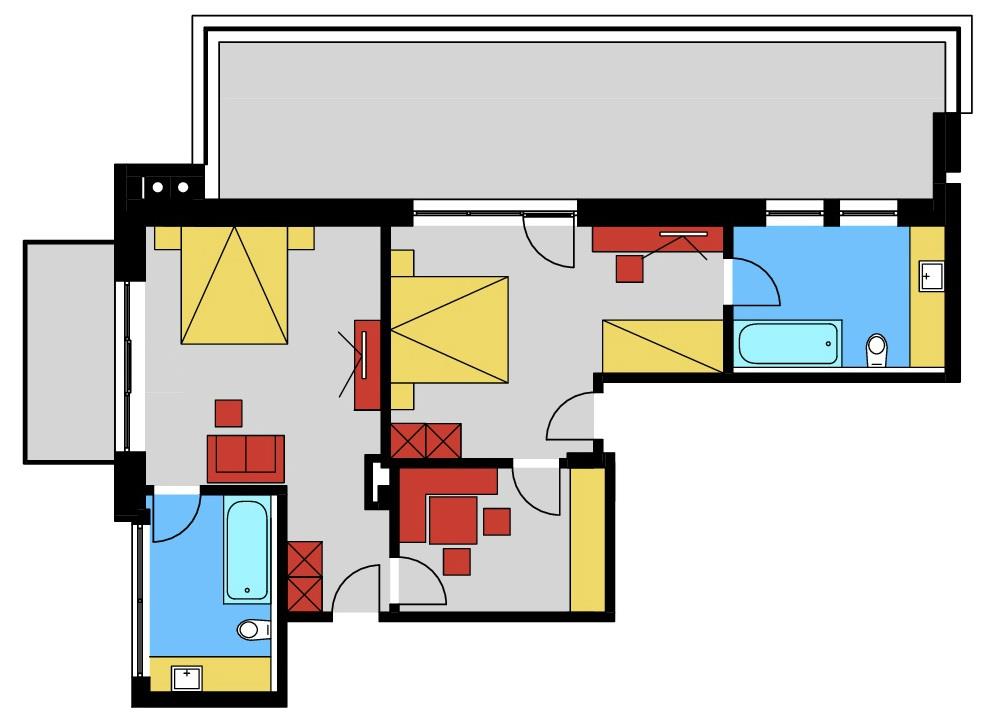 Komfortable Wohnung, gesamt ca. 65m², mit 2 Schlafzimmern mit jeweils angrenzendem separaten Badezimmer (gesamt also 2 Stück, jeweils mit Badewanne) und einer gemeinsamen Küche mit Essbereich. Je 1 Balkon pro Schlafzimmer – 1 nach Norden und 1 nach Westen gerichtet. Wohnung wird täglich gereinigt - lediglich der Abwasch ist von Ihnen selbst zu erledigen.
