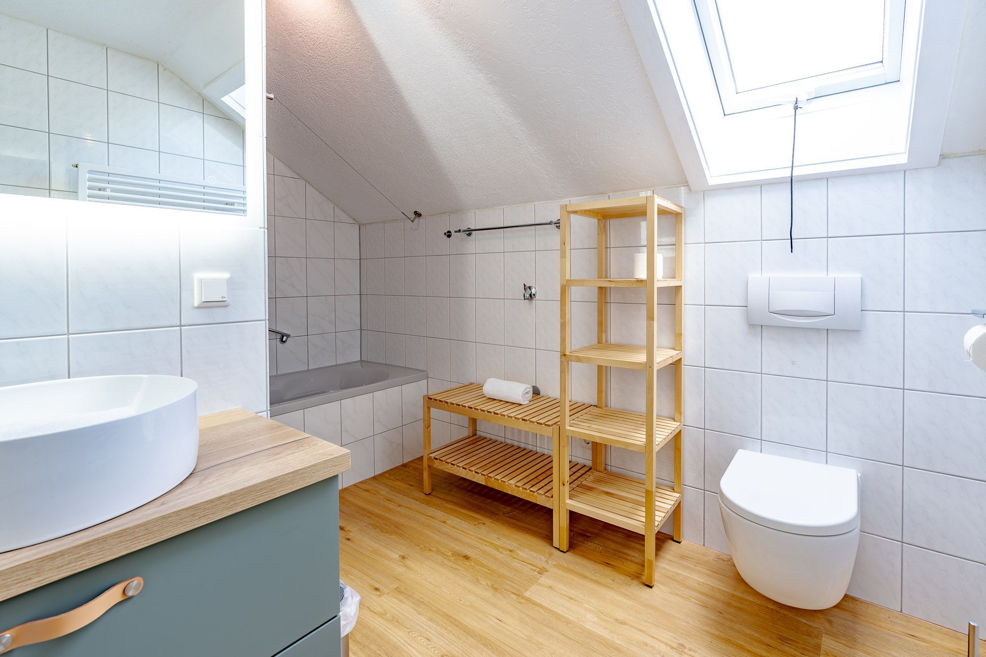 Das Badezimmer ist mit Badewanne, Waschbecken und WC ausgestattet.