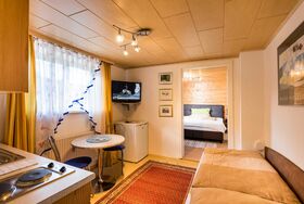 Alle unsere Apartments sind mit einer vollständig eingerichteten Küche (inkl. Geschirr), TV, W-LAN, Safe und Föhn ausgestattet. Im selben Gebäude befindet sich ein Haushaltsraum (Waschmaschine, Wäschetrockner, Wäscheständer), der gerne genutzt werden kann. Die Fitnessraum- und Saunanutzung in der nahe gelegenen Genuss-Pension Herti ist im Apartmentpreis mitinbegriffen. Pro Apartment steht ein Parkplatz kostenlos zur Verfügung.