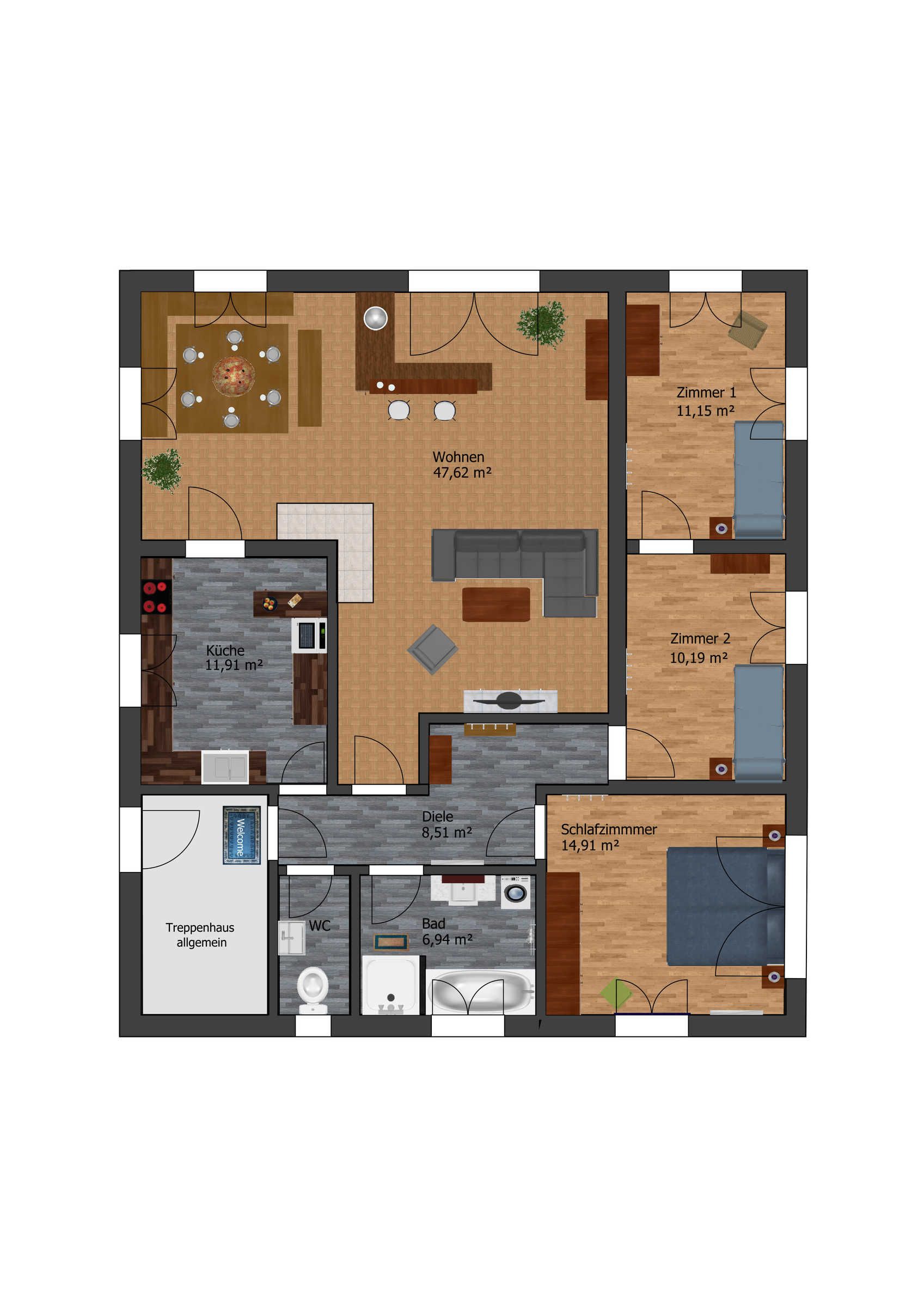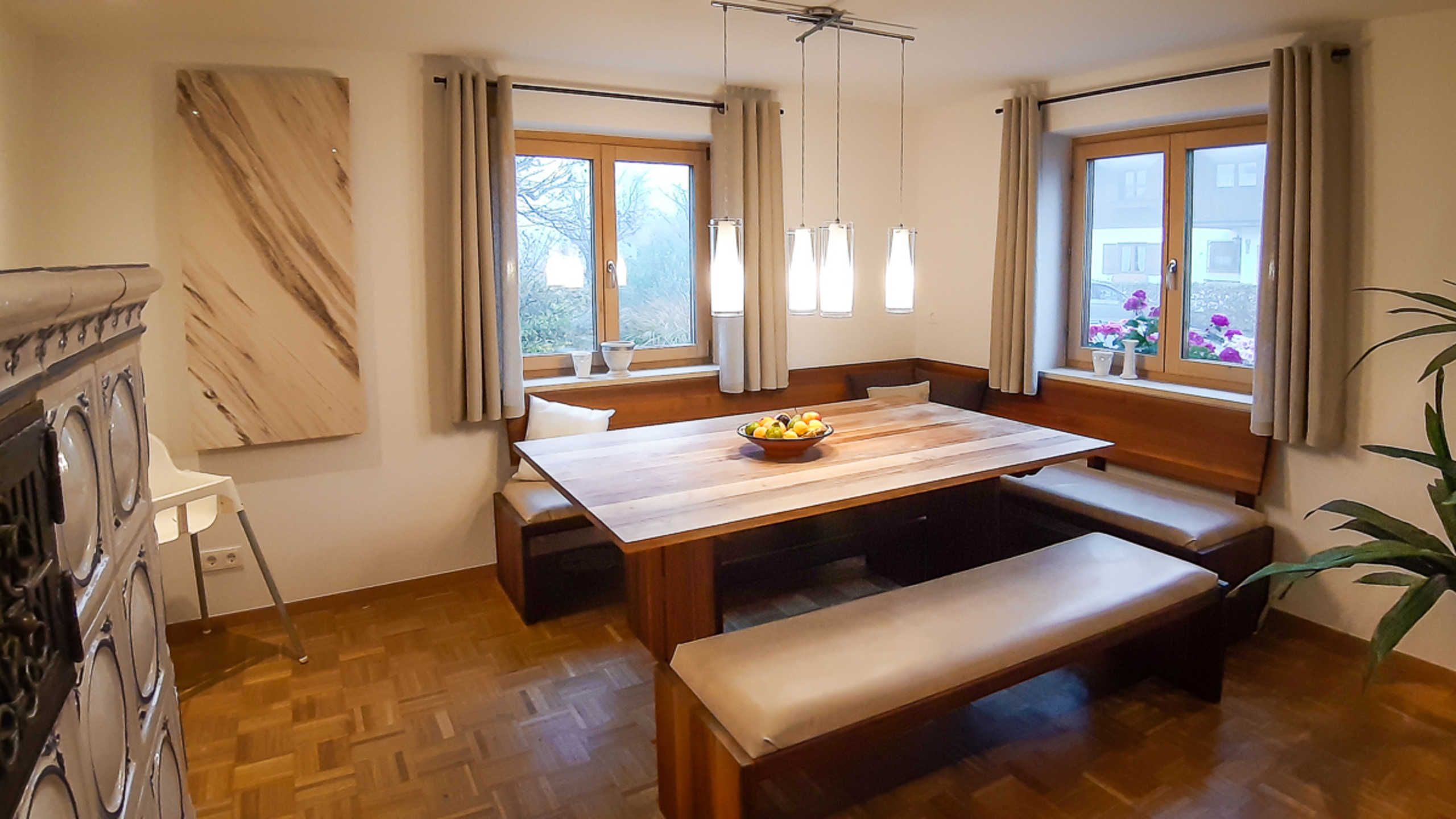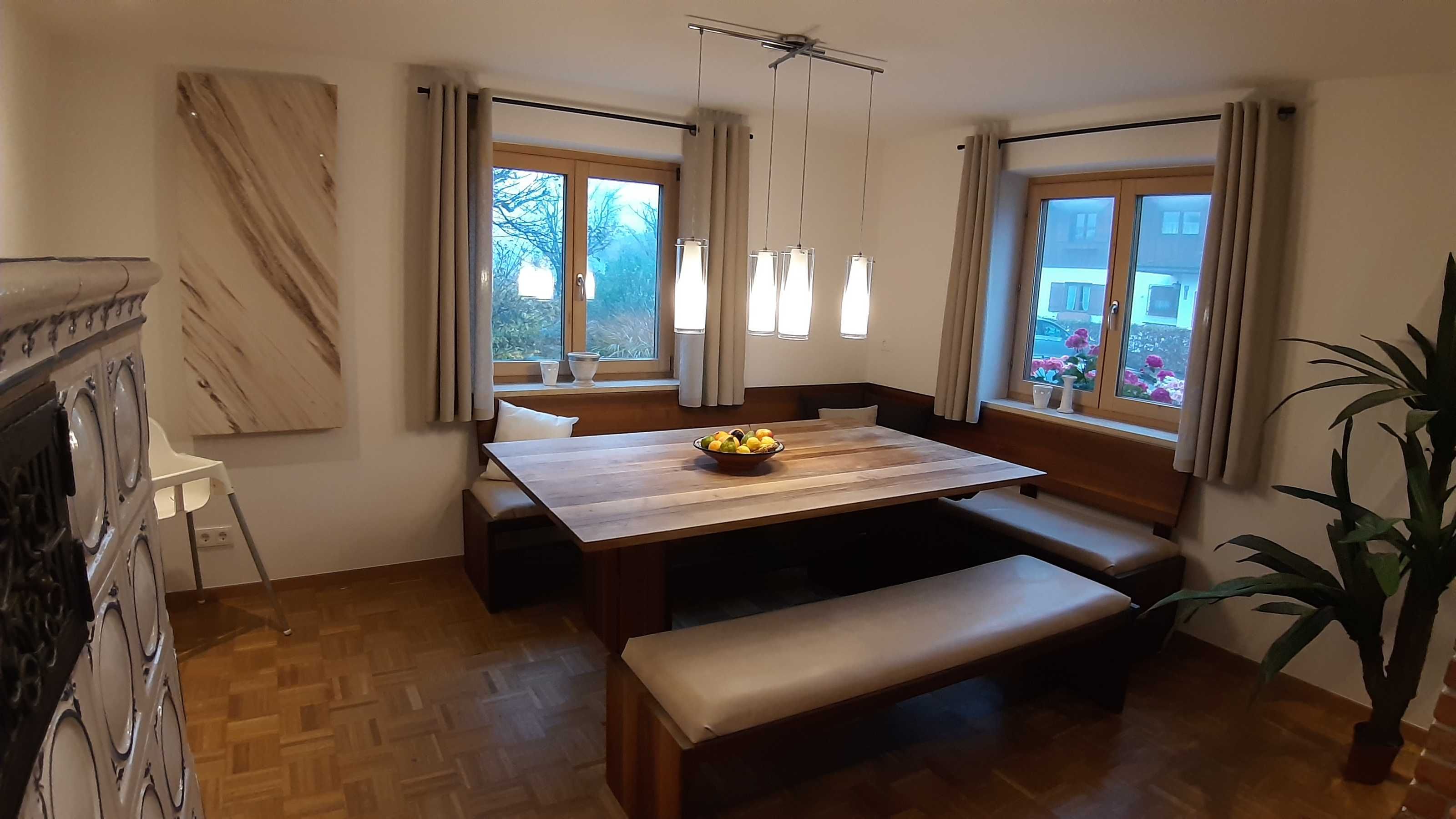Unsere Ferienwohnung „Holzeralmblick“ ist im Erdgeschoss eines Mehrfamilienhauses sehr ruhig in Seenähe gelegen. Sie verfügt neben Küche, Bad und Wohnraum über ein Doppelbett- und zwei Einzelbettzimmer und ist insgesamt großzügig und komfortabel eingerichtet. Es handelt sich um eine Nichtraucherwohnung, die für Allergiker geeignet ist, da Haustiere verboten sind. Die Wohnung besitzt größtenteils Parkett-Fußböden und eine Terrasse Richtung Süden, auf der bis zum Mittag die Sonne scheint.