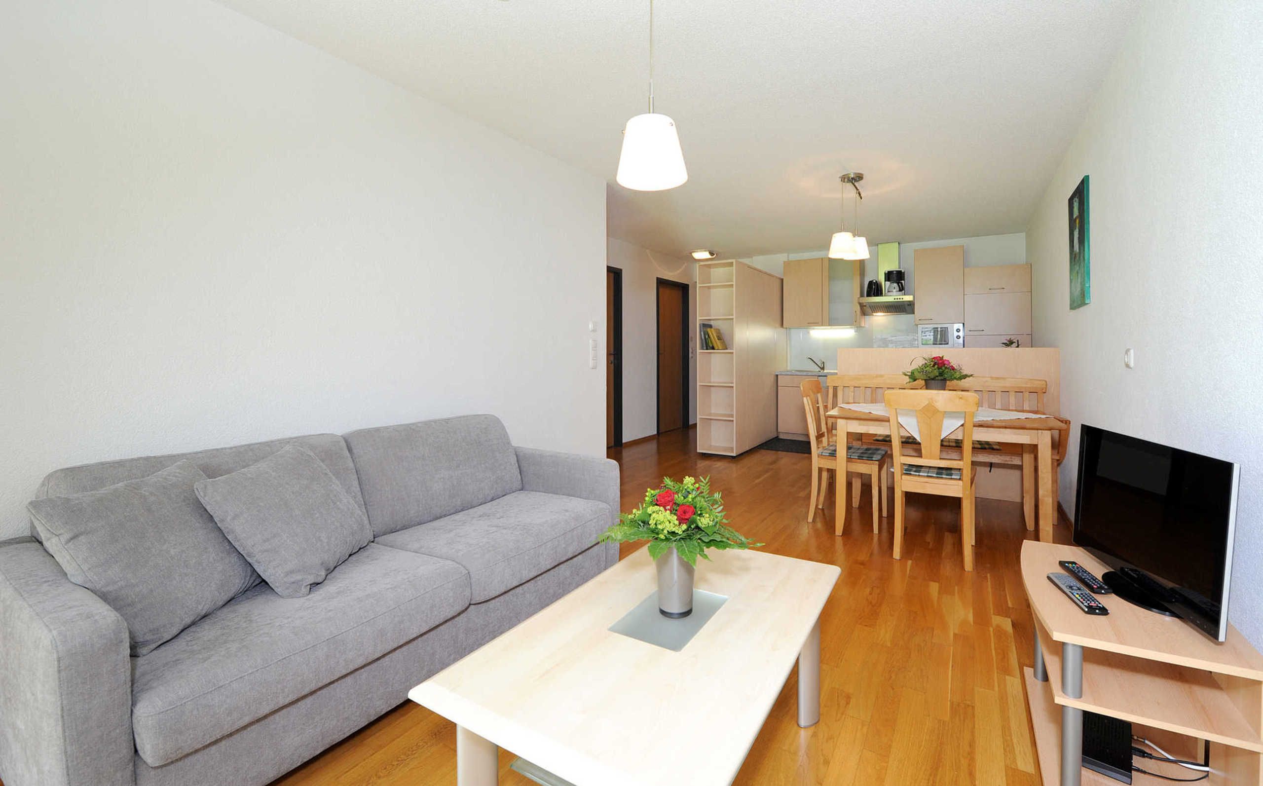 Geräumiges, komfortabel ausgestattetes Apartment für 2 - 4 Personen mit Balkon (südseitig), Wohn-Ess-Küche, Dusche, WC extra.