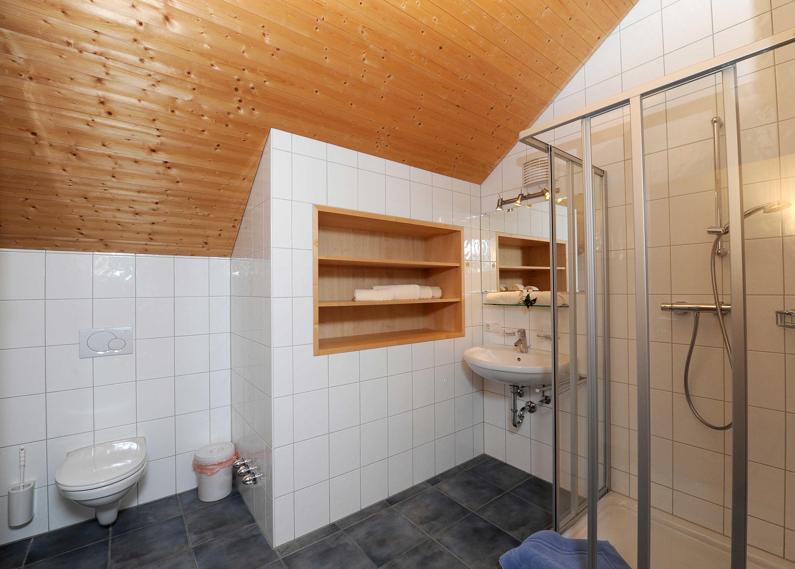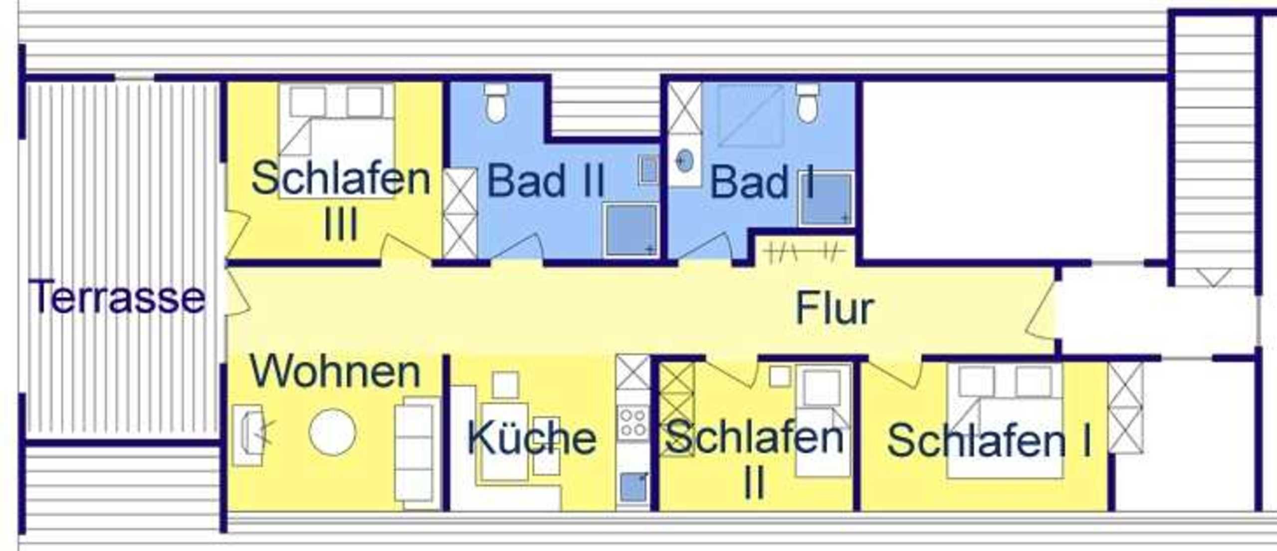 zwei Doppelzimmer mit jeweils Dusche mit WC, Stockbett-zimmer, Wohn- Essküche und südwestseitiger Balkon.
