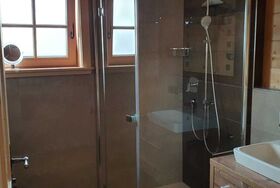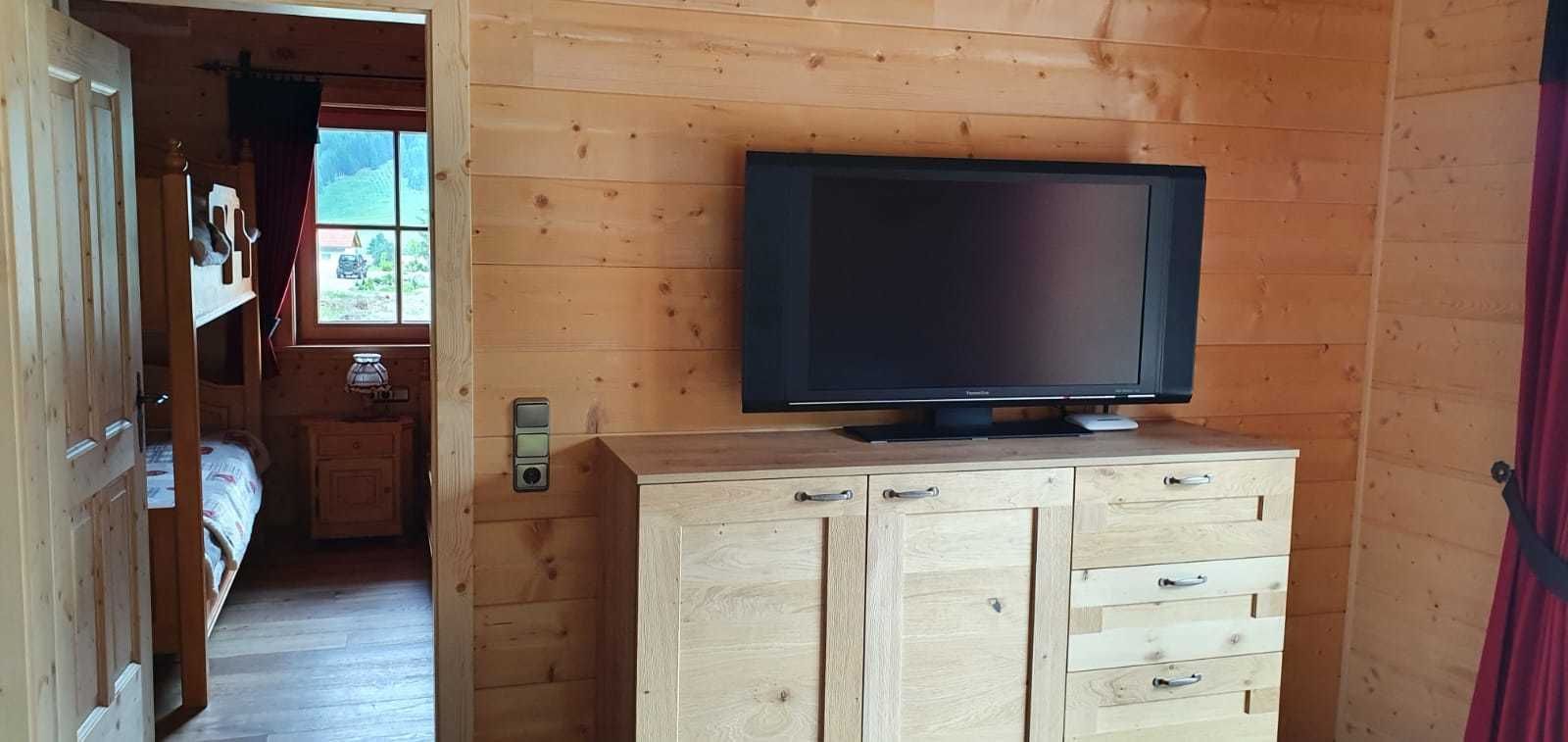 Geräumige Dusche in zeitgemäßer Ausführung mit Außenfenster, WC seperat mit Außenfenster. Hochwertige Einbauküche mit geräumigem Esszimmer. Wohnzimer mit direktem Ausgang zur Terrasse und Blick auf die Berge. Im Schlafzimmer befindet sich ein Doppelbett und ein Hochbett.