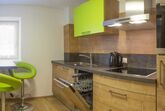 Walk-in Dusche, Haarföhn, Geschirrspüler, Ceranfeld, Backrohr, Nespresso Maschine, Wasserkocher, Toaster, Kühlschrank mit Gefrierfach, moderne Gartenmöbel