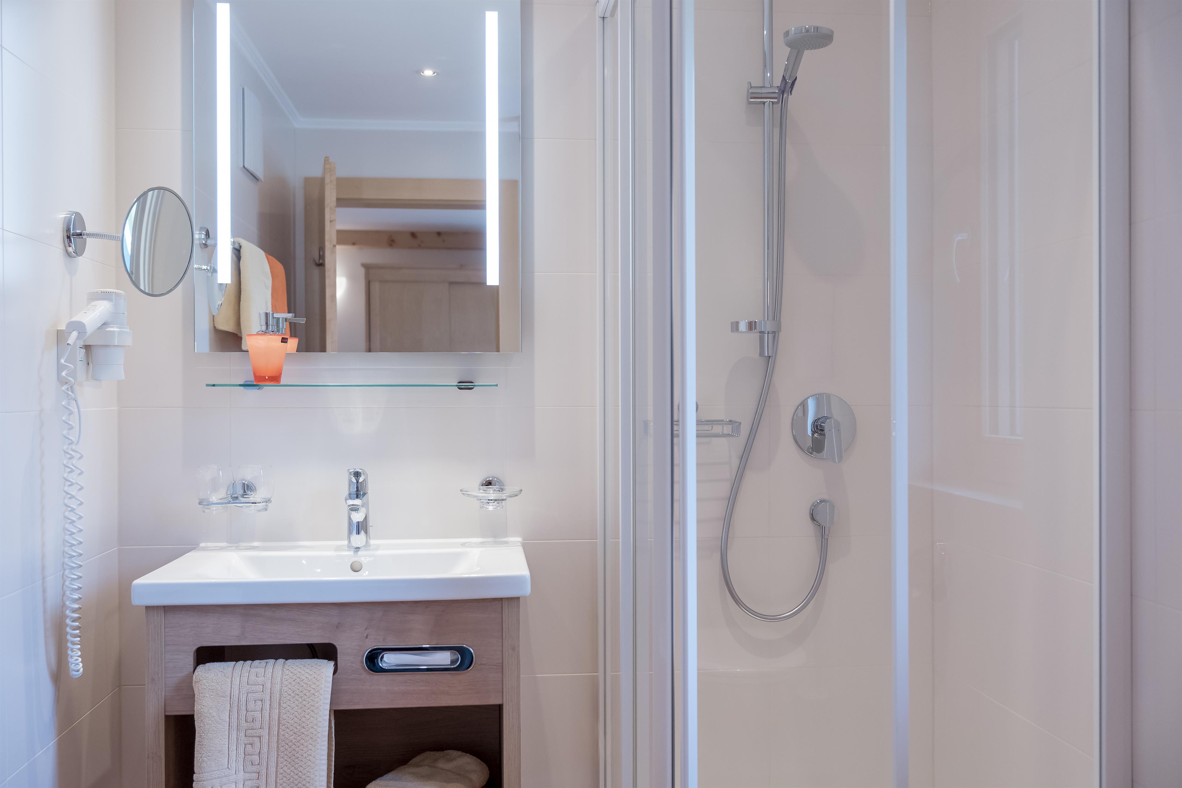 Erleben Sie diese Wohlfühlatmosphäre in den 3 Bio-Zirbenzimmer mit Eichenholzboden jeweils mit separaten Dusche/WC/Flat-TV, Föhn und Kosmetikspiegel, sowie einem WC separat.