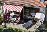 Eine Terrasse mit Gartenmöbeln und Burgblick, eine zweite Terrasse zur Südseite mit Grill, Markise, großem Marktschirm, Sonnenliege und Hollywood-Schaukel.