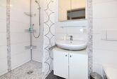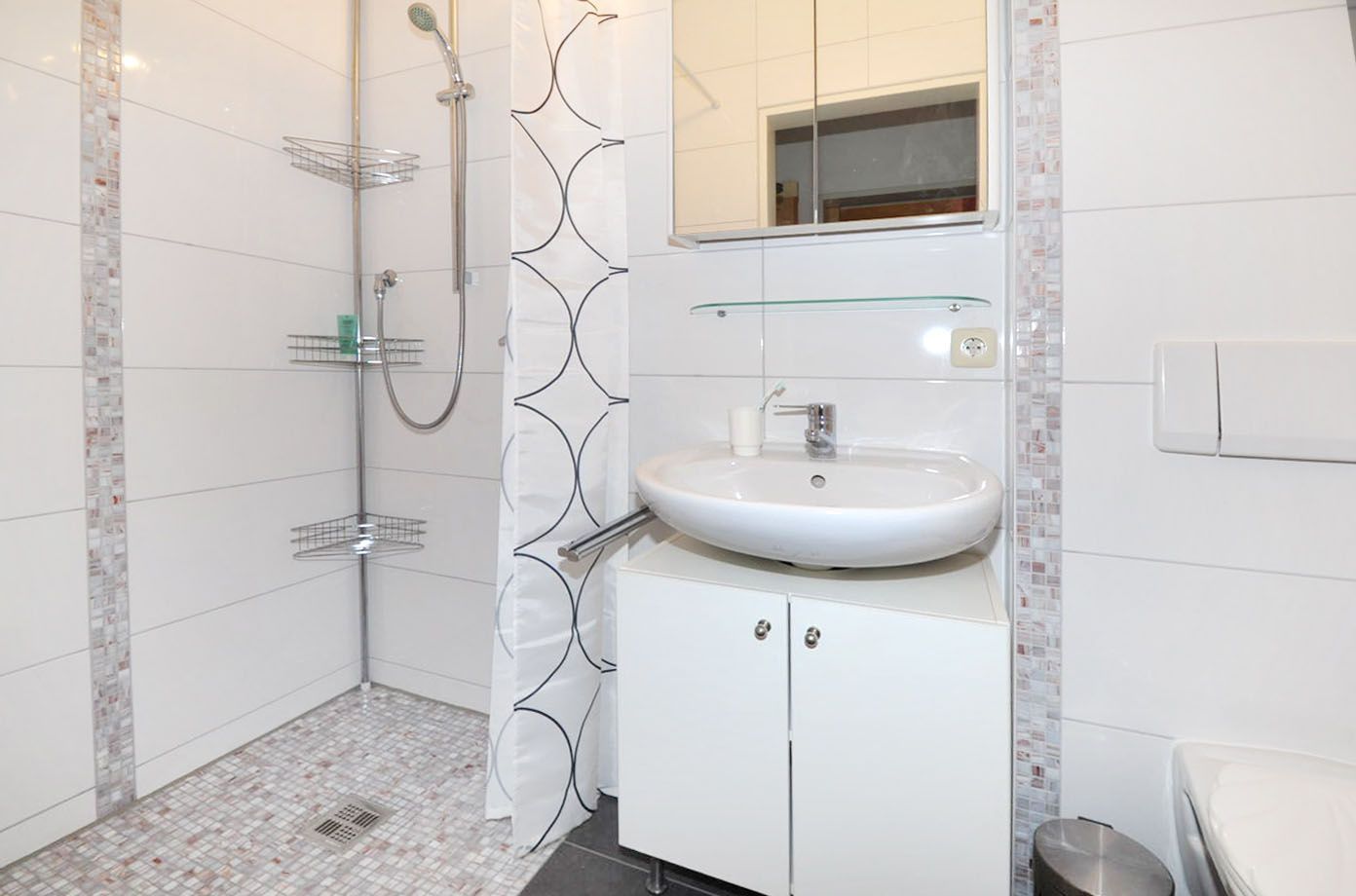Das geflieste Bad mit ebenerdiger Dusche, mit Föhn und Hocker / WC.