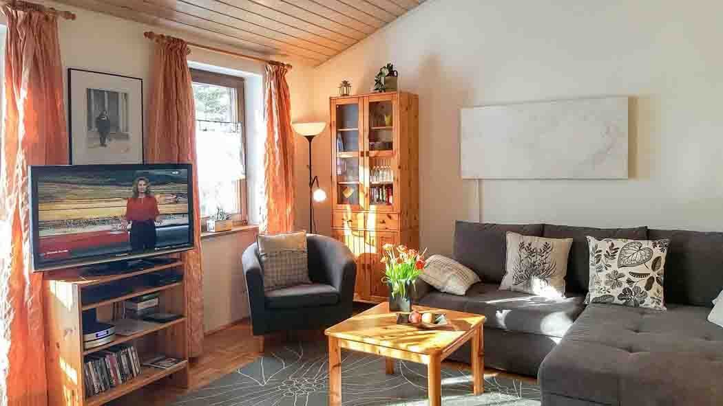 Der Wohn-/Schlafraum mit moderner und sehr bequemer Doppelbettcouch und einem Kaminofen, Stereoanlage mit CD/Mp3 Player und Blu-ray Player, kostenloses WLAN, SAT-TV, sky und Telefon, im Schrank finden sie Bücher und Spiele.