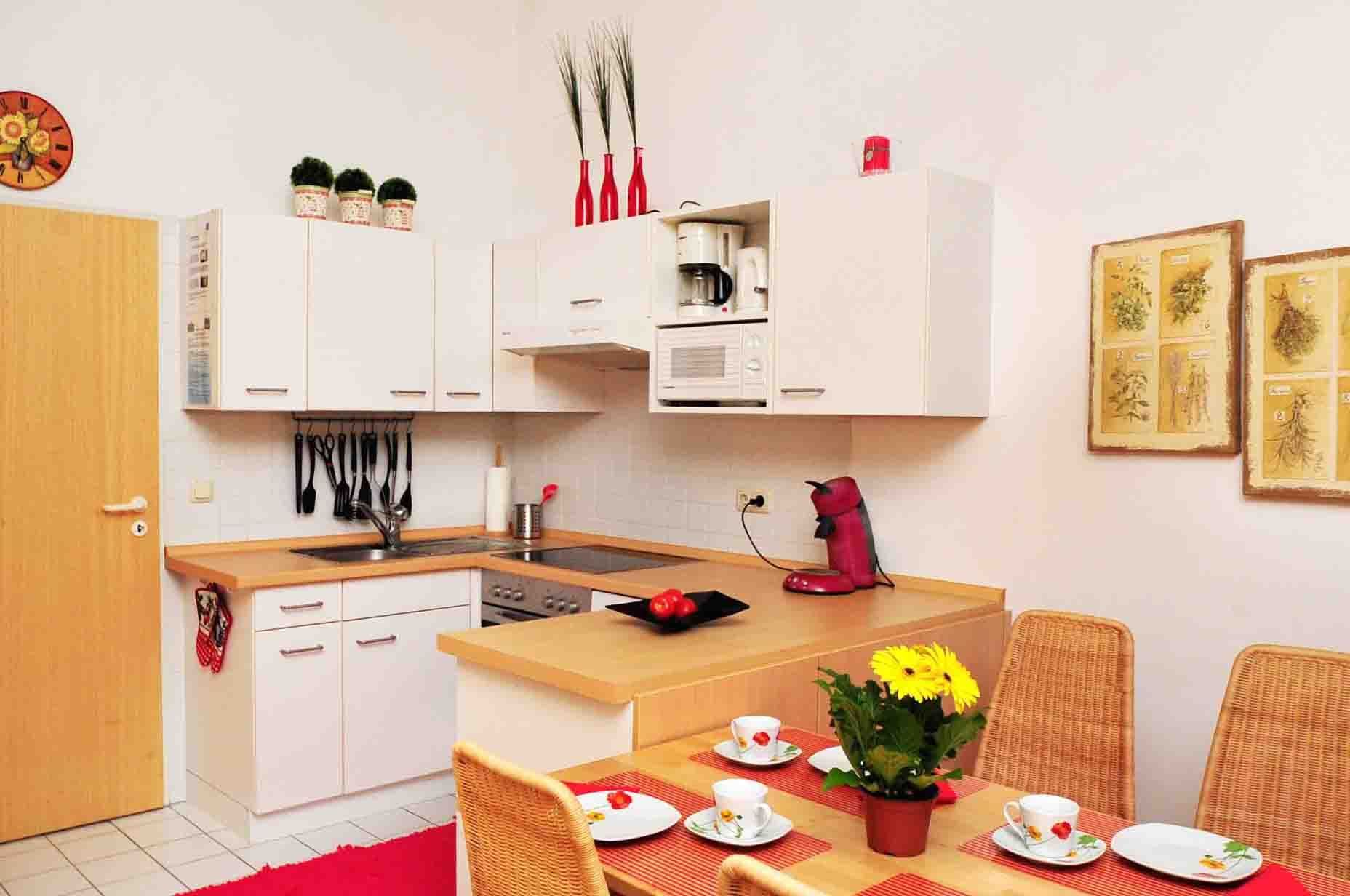 Ein separater Essplatz mit voll ausgestattetem Küchenbereich mit Geschirrspüler, Mikrowelle, Senseo Kaffemaschine, zusätzlicher standard Kaffeemaschine, Eierkocher, Toaster und Rührgerät mit Mixer.