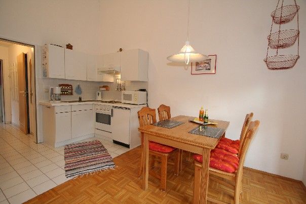 Sie wohnen in einem 2-Zimmer-Appartement für bis zu 4 Personen, ca. 48 m², ein Schlafzimmer mit Doppelbett, Wohn-/Schlafraum mit bequemer Doppelbettcouch, separater Essplatz, voll ausgestatteter Küchenbereich mit Mikrowelle, Diele mit Garderobe, Dusche/WC, Balkon, SAT-Flachbild-TV und Telefon.