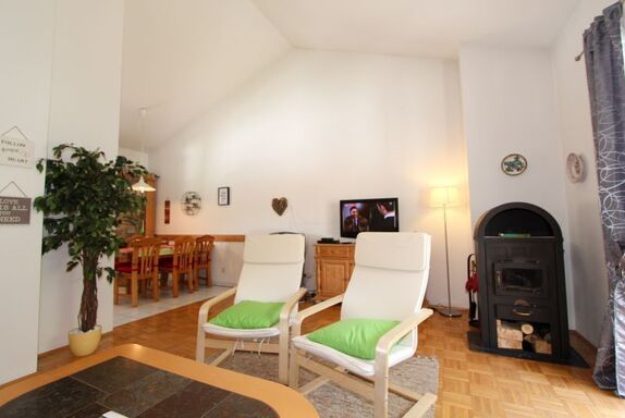 Schlafgalerie für 2 Personen. Wohnraum mit hübscher Sitzgarnitur, separater Essplatz, Kaminofen, voll