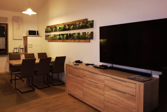 Der große Wohnbereich bietet viel Platz zum Spielen und Relaxen. Der Fernseher mit sky-Empfang und der angeschlossenen Soundbar sowie DVD Player ermöglicht entspannte Fernsehabende. Das große Ecksofa lädt zu spaßigen Spieleabenden oder gemütlichen Lesestunden ein. Durch den eingebauten Pellet-Ofen kann man sicher und per Knopfdruck die wohlige Wärme des Feuers genießen. Und dies ohne anzünden, Holz nachlegen oder Asche wegräumen. Der Ofen ist einfach über einen Touchdisplay zu bedienen.