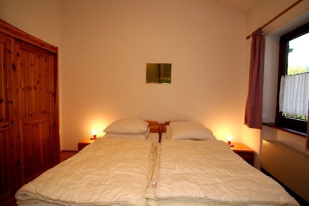 Obergeschoss. Ein Schlafraum mit Doppelbett, ein Schlafzimmer mit zwei getrennten Betten und