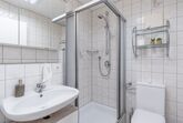 Das Badezimmer beinhaltet eine Dusche, ein Waschbecken, ein Föhn und ein WC.