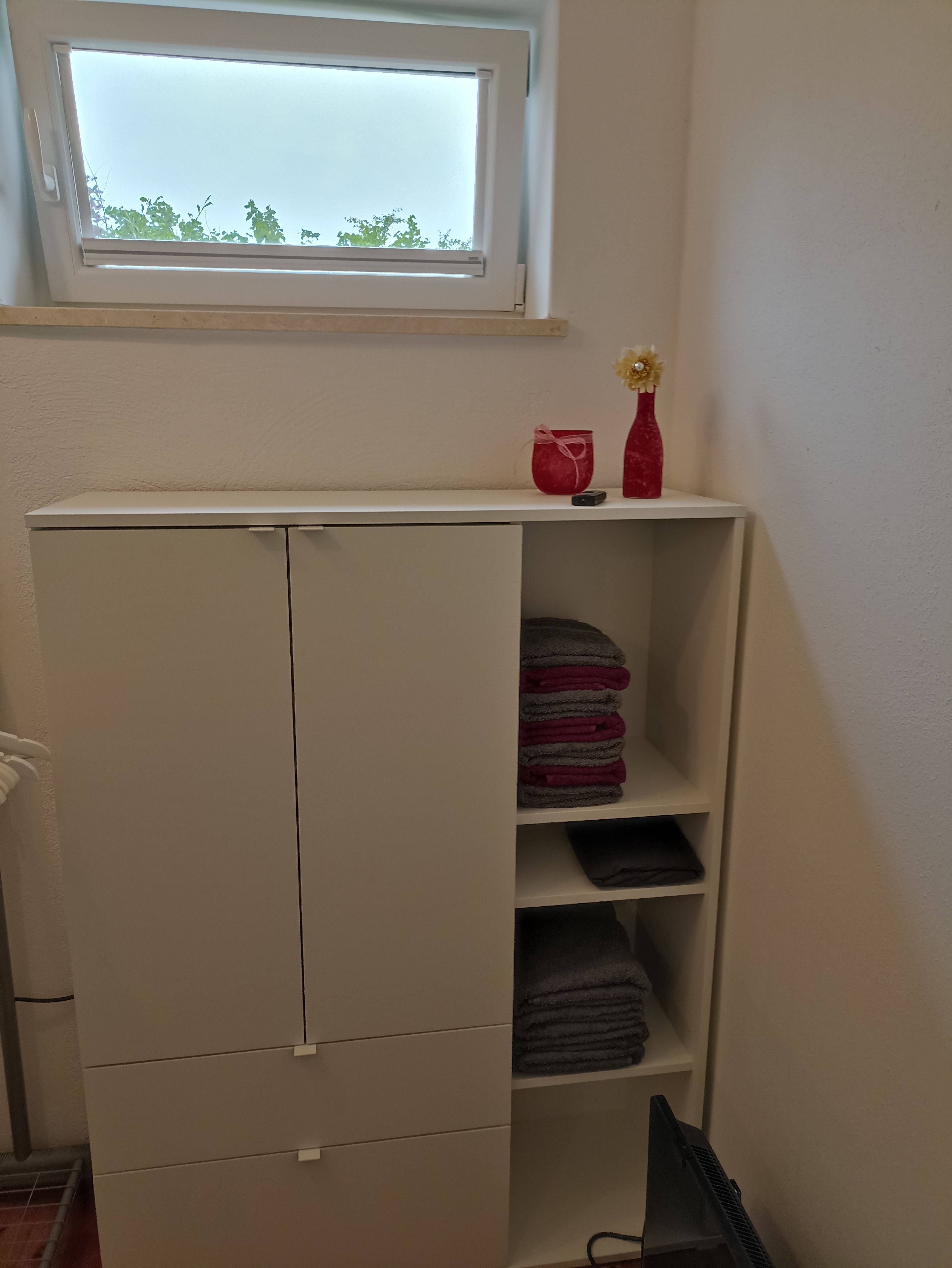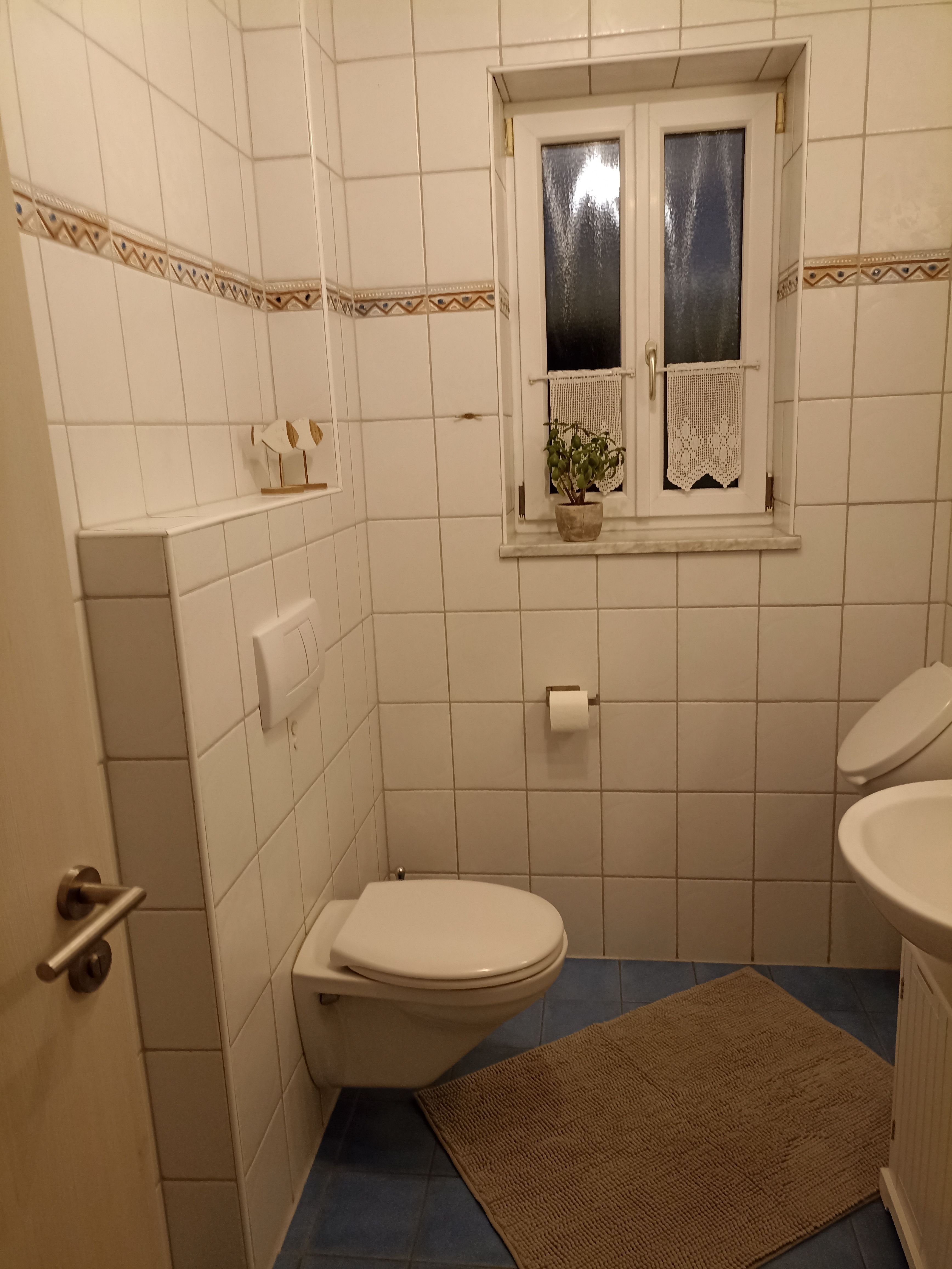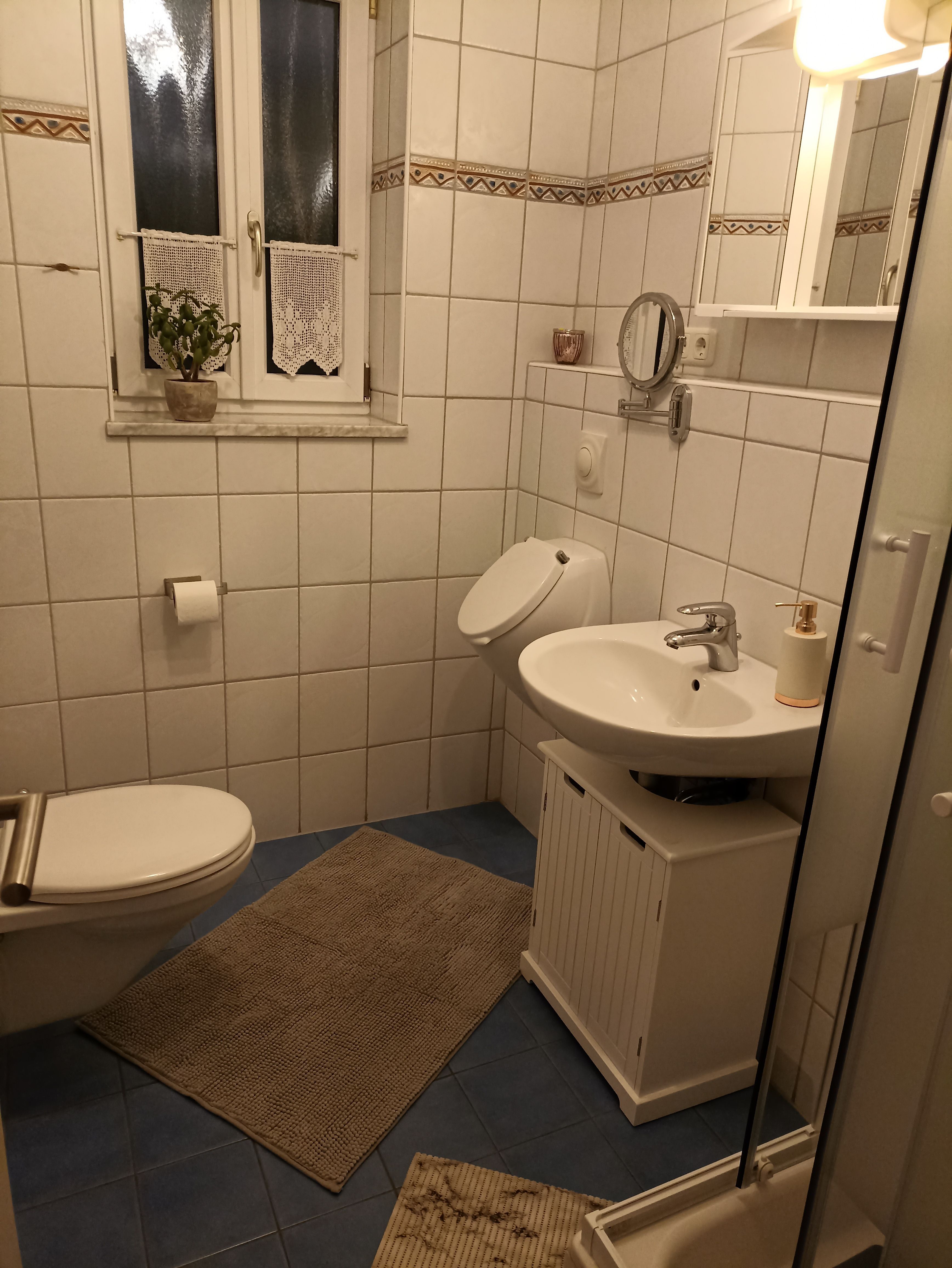 Im hellen Badezimmer befindet sich eine Dusche sowie Föhn, WC, Waschbecken und ein Pessar.