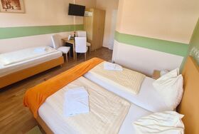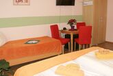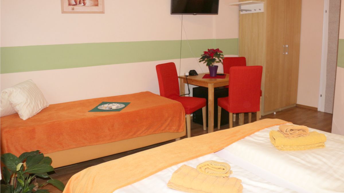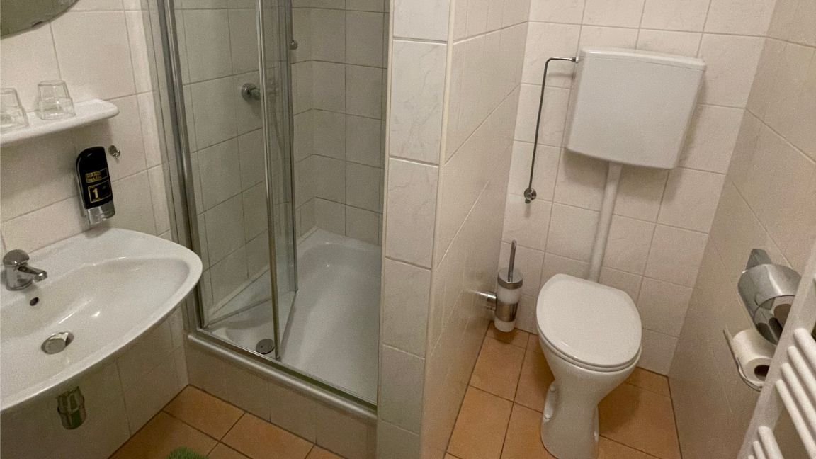 Das Zimmer verfügt über einen gemütlichen Schlafbereich, mit Sitzecke, kleinem Kühlschrank und Schrank. Das Badezimmer ist ausgestattet mit Dusche, Waschbecken, WC, Föhn und Badeartikel. Das Zimmer liegt auf der Ostseite/Bachseite.
