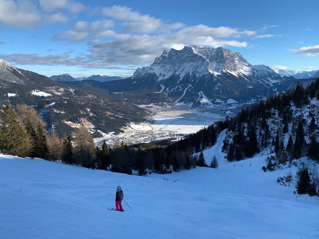 Sonniger Balkon mit Blick zur Skipiste und Dachterrasse mit Blick zur Zugspitze