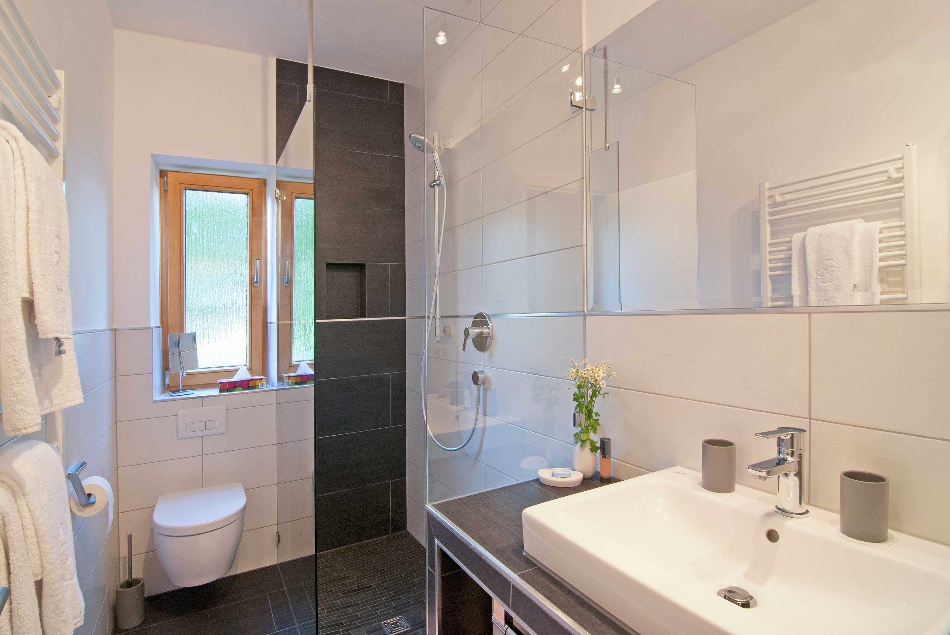 Badezimmer mit Fußbodenheizung, bodengleicher walk-in Dusche, Handtuchwärmer, Wachbecken und WC