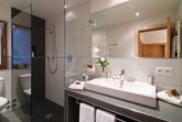 Bad mit ebenerdiger Walk-in Dusche, Waschbecken und WC, Haartrockner, Kosmetikspiegel und Bademantel