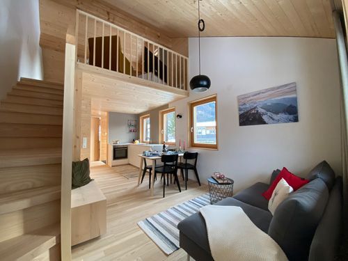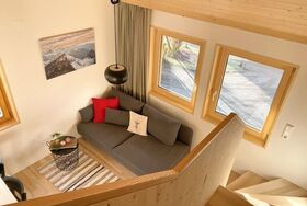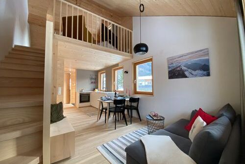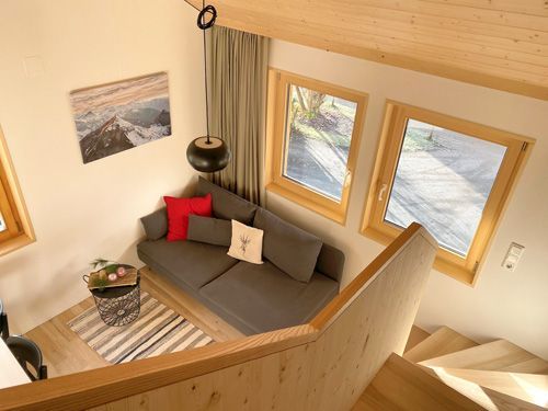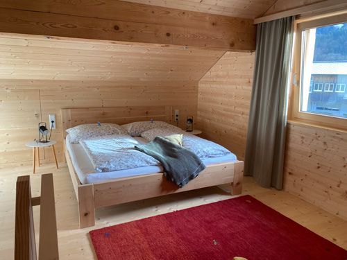 Den Schlafraum erreichen Sie über eine offene Treppe im zweiten Geschoß. Genießen Sie den feinen Duft des Zirbenbettes und genießen Sie die Wärme, die das naturbelassene Holz ausstrahlt.