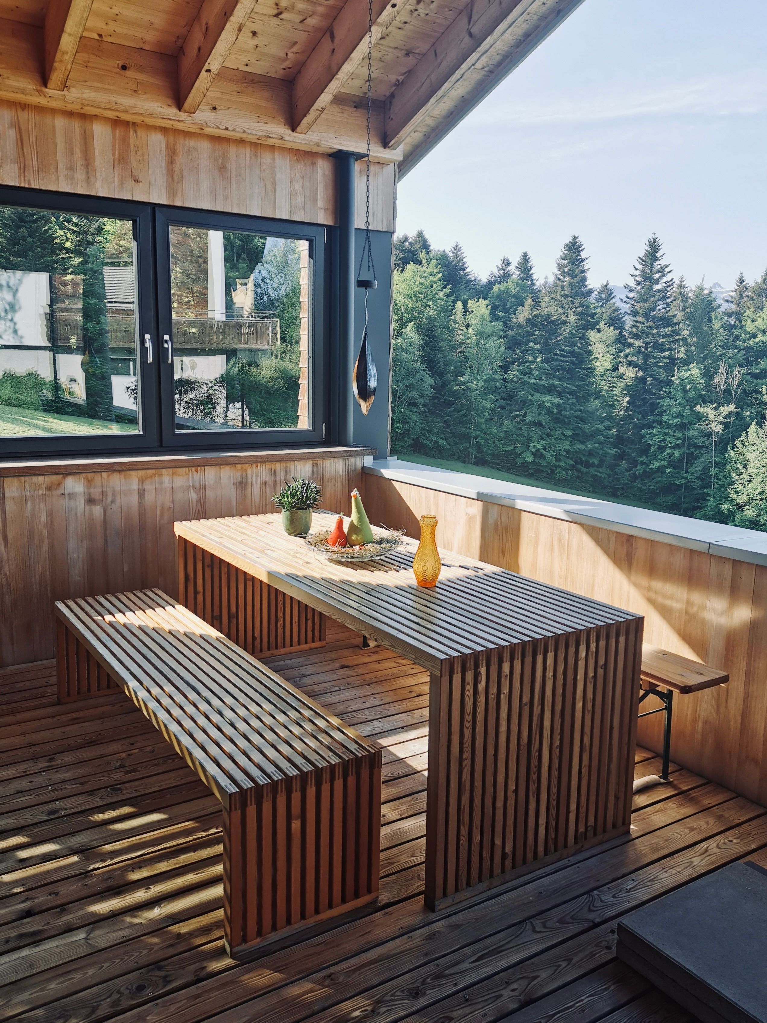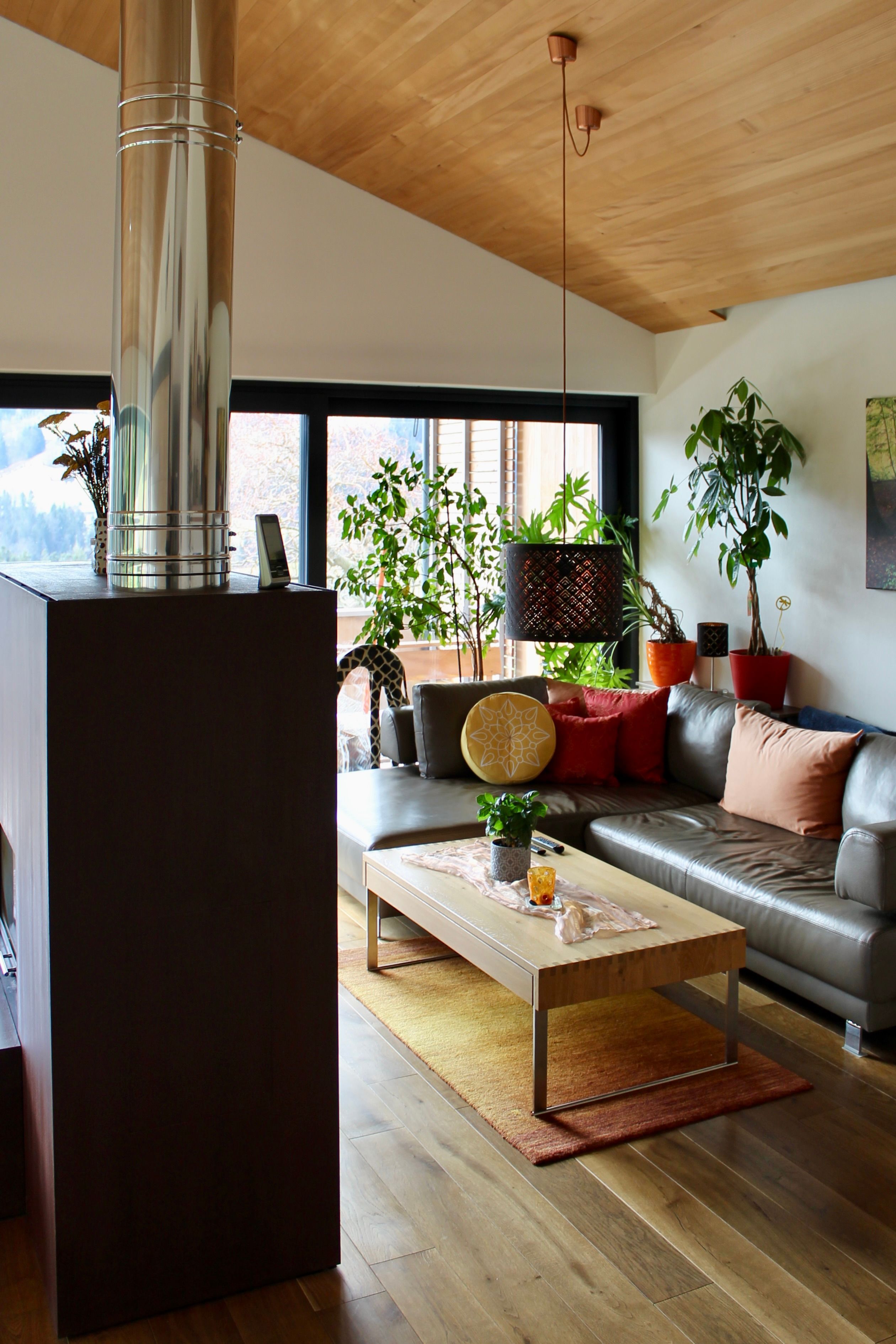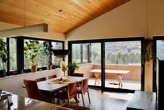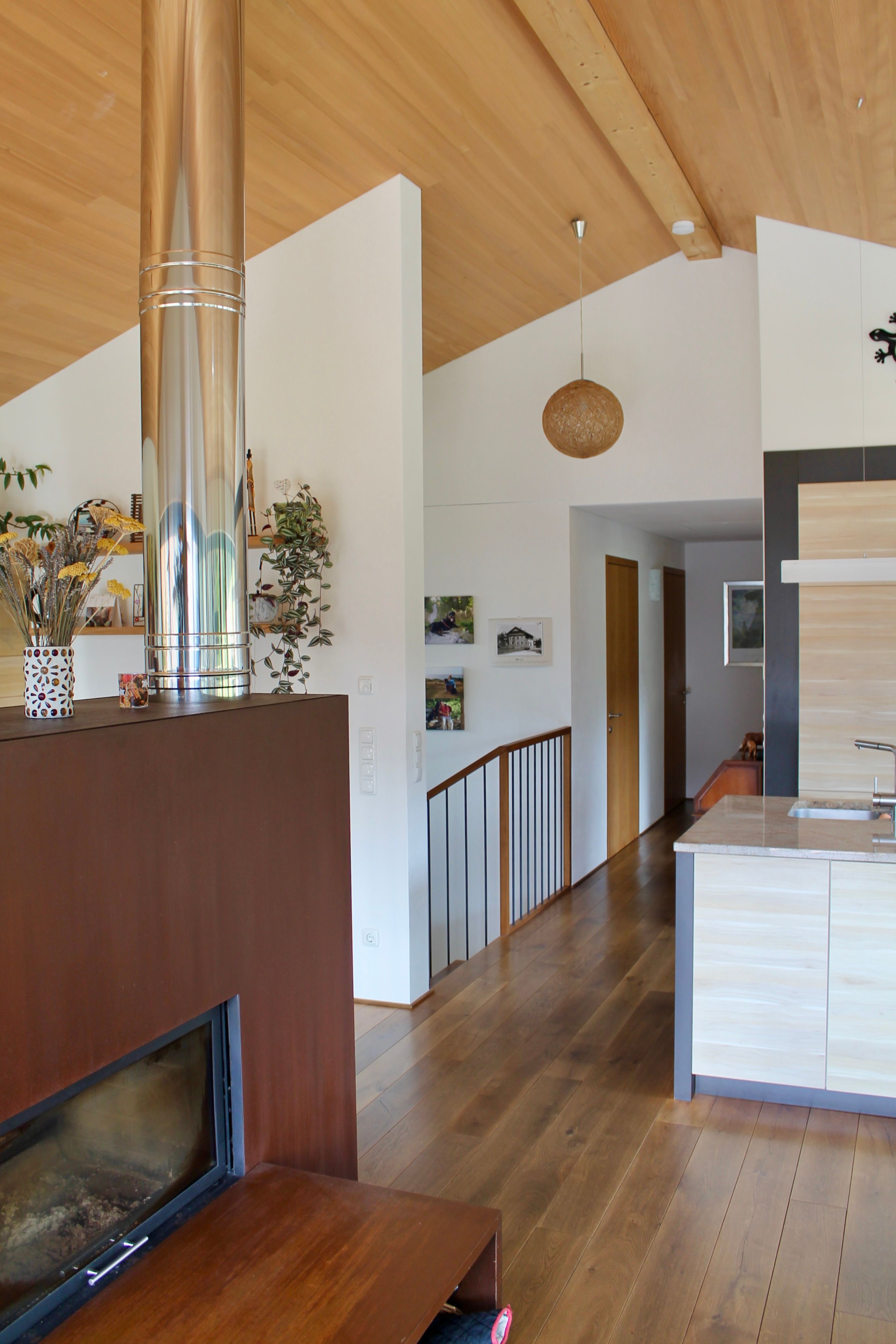 Von der großzügigen und überdachten Südterrasse aus hast du einen herrlichen Blick in die unverbaute Natur. Der Eingangsbereich liegt im Erdgeschoß. Über eine schöne Holztreppe erreichst du den offenen Wohnbereich.