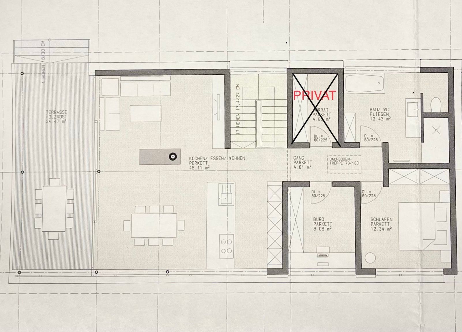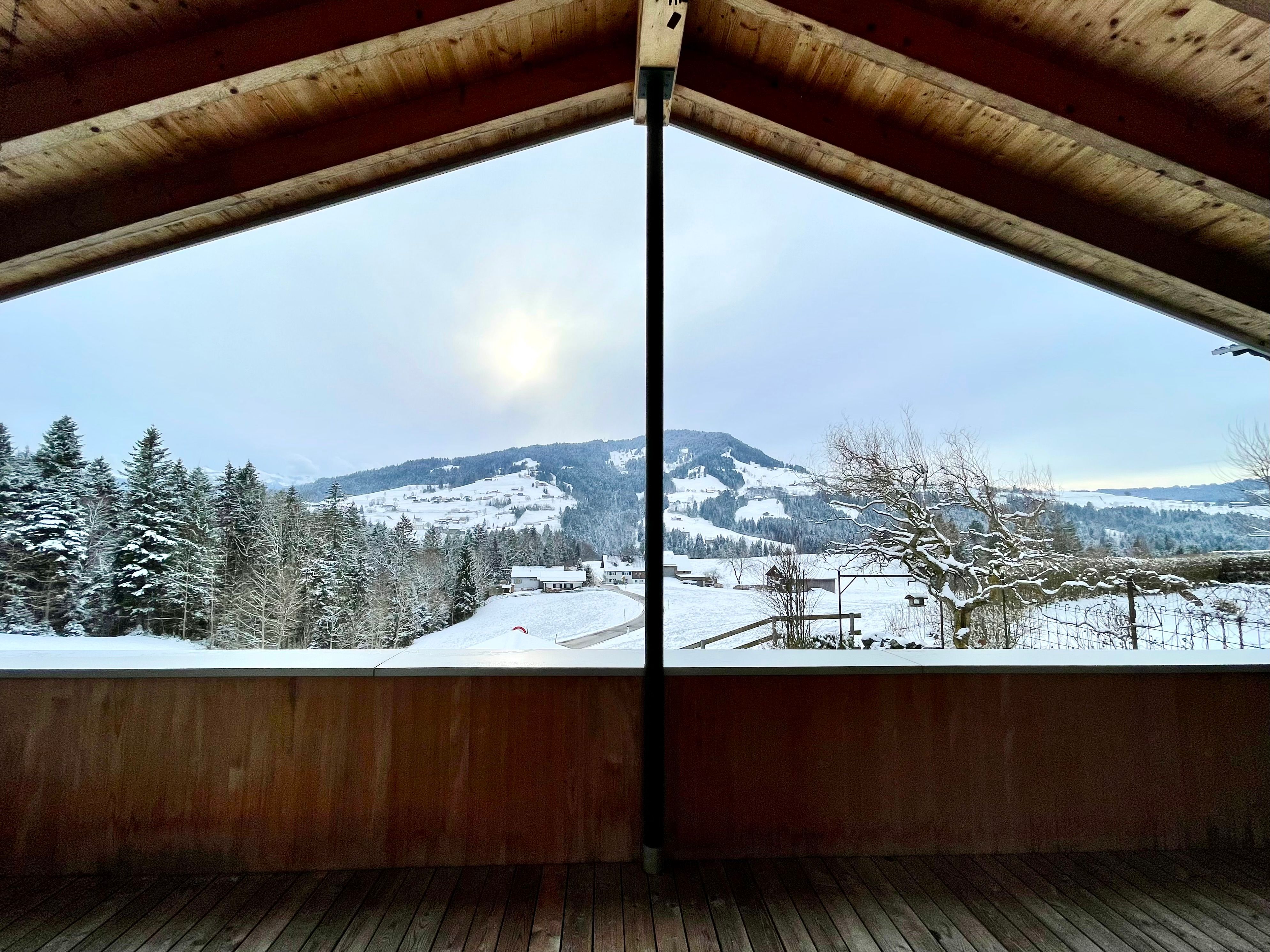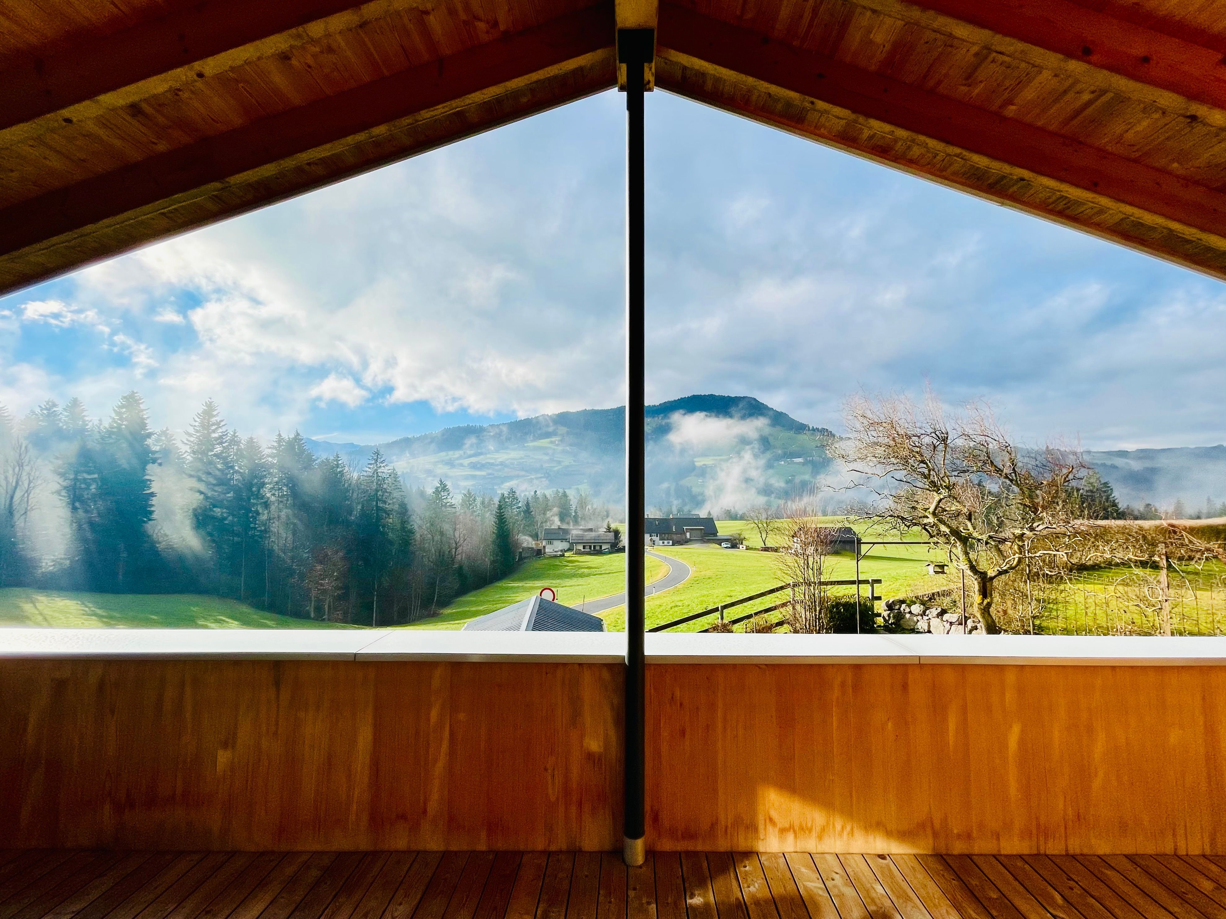 Von der großzügigen und überdachten Südterrasse aus hast du einen herrlichen Blick in die unverbaute Natur. Der Eingangsbereich liegt im Erdgeschoß. Über eine schöne Holztreppe erreichst du den offenen Wohnbereich.
