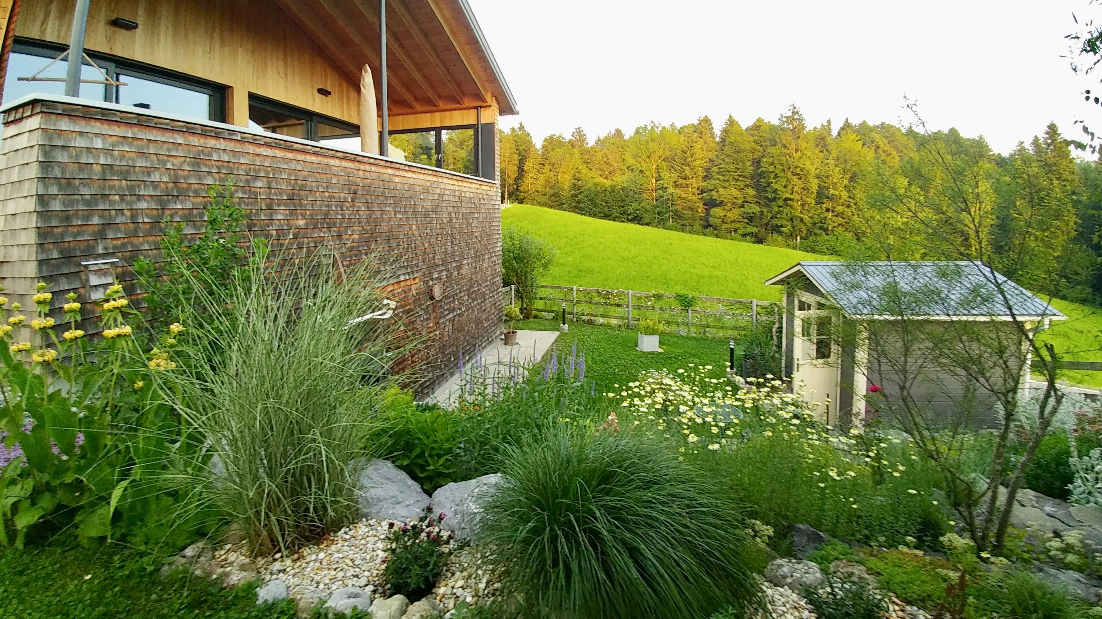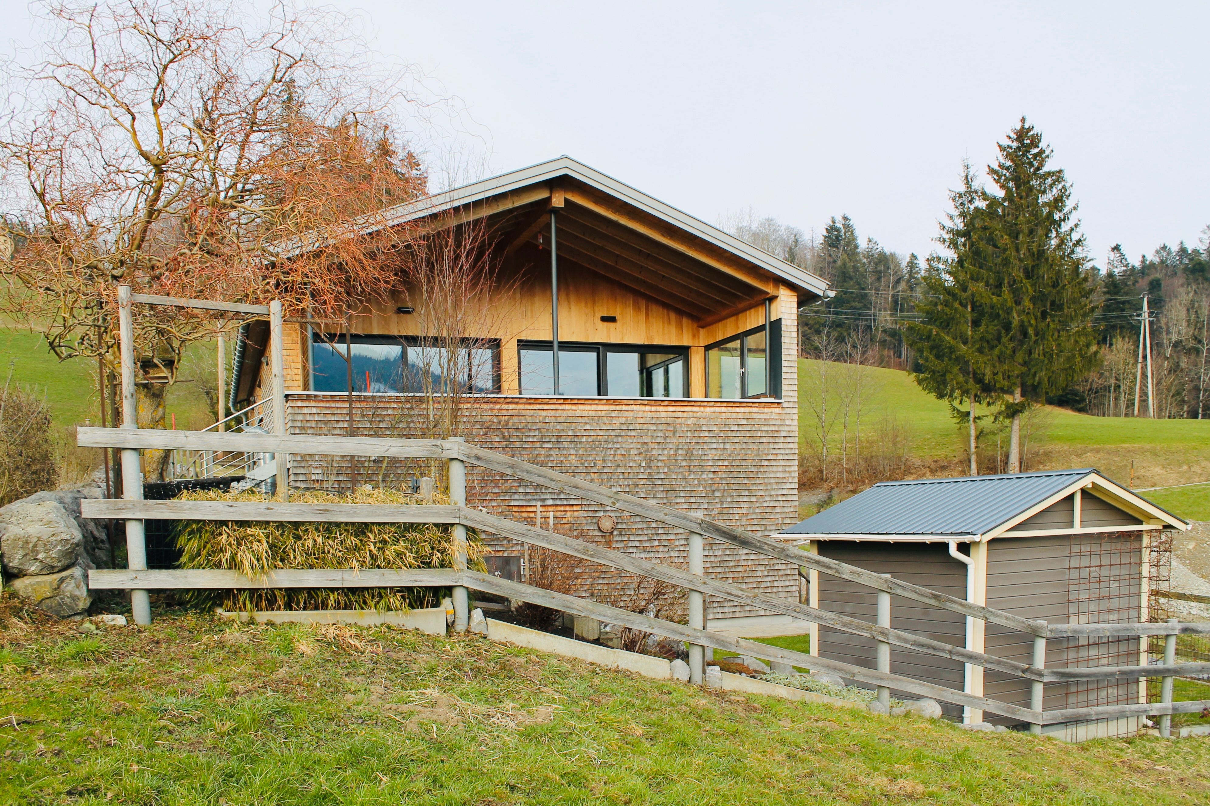 Das Wohnhaus wurde 2011 in moderner Bregenzerwälder Bauweise errichtet und ist komfortabel und komplett ausgestattet. Es verfügt über ein gemütliches Schlafzimmer und ein Büro mit toller Aussicht auf den Wald, ein Bad mit begehbarer Dusche und Badewanne, eine komfortable und komplett ausgestattete Wohn-/ Essküche. Ein moderner Holzofenkamin dient als Raumteiler und Blickfang zwischen der gemütlichen Couchecke und der Wohnküche.