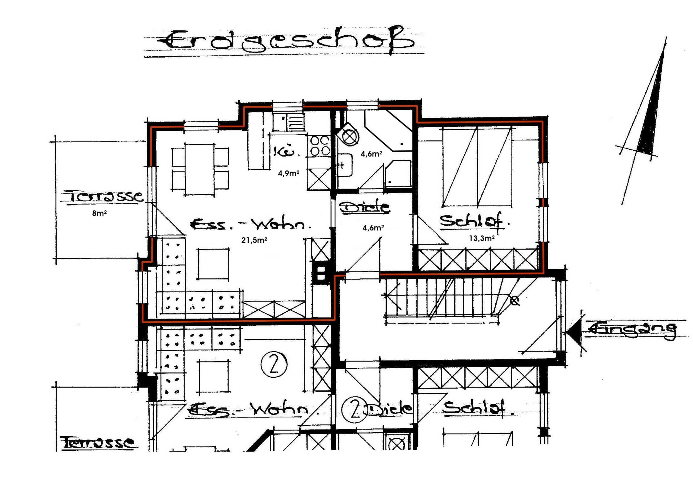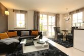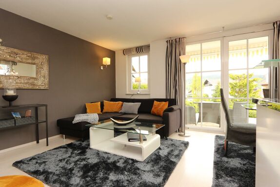 2-Zimmer-Wohnung mit gehobener Ausstattung für 2 - 3 Personen (ca. 52 m²) im Hochpaterre mit Schlafzimmer, Wohn- und Esszimmer, Terrasse, Küche und Bad.