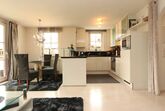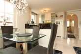 • Wohn- und Esszimmer mit Sofa, Esstisch, Sichtverbindung zur offenen Küche, Flachbildfernseher am Kabelanschluss, CD-Player.
