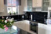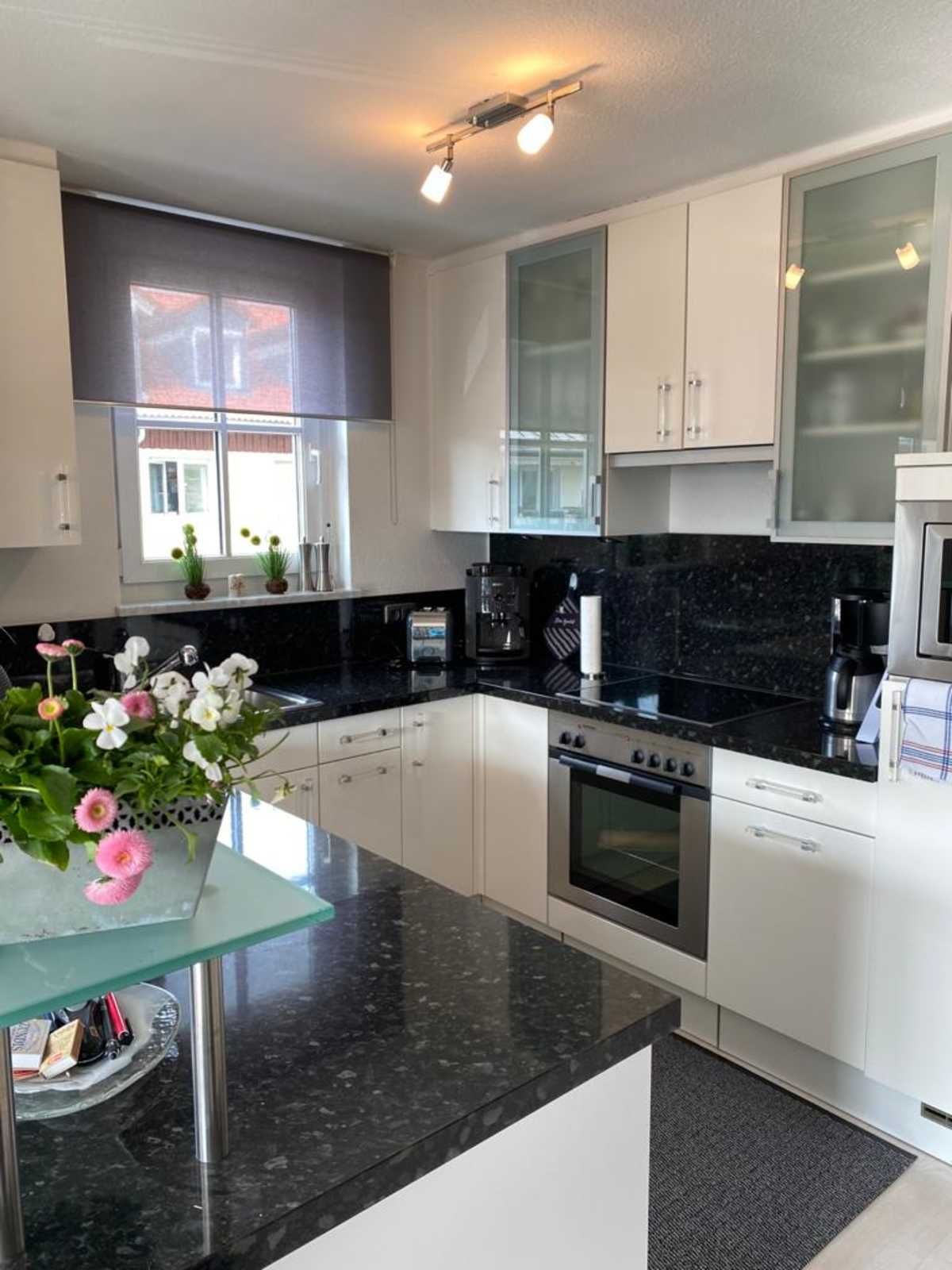 • komplett eingerichtete moderne Einbauküche mit Geschirrspüler,.Glaskeramikkochfeld, Backofen, Mikrowelle, Kühlschrank, Toaster, Eierkocher, Kaffeemaschine, Wasserkocher, usw.