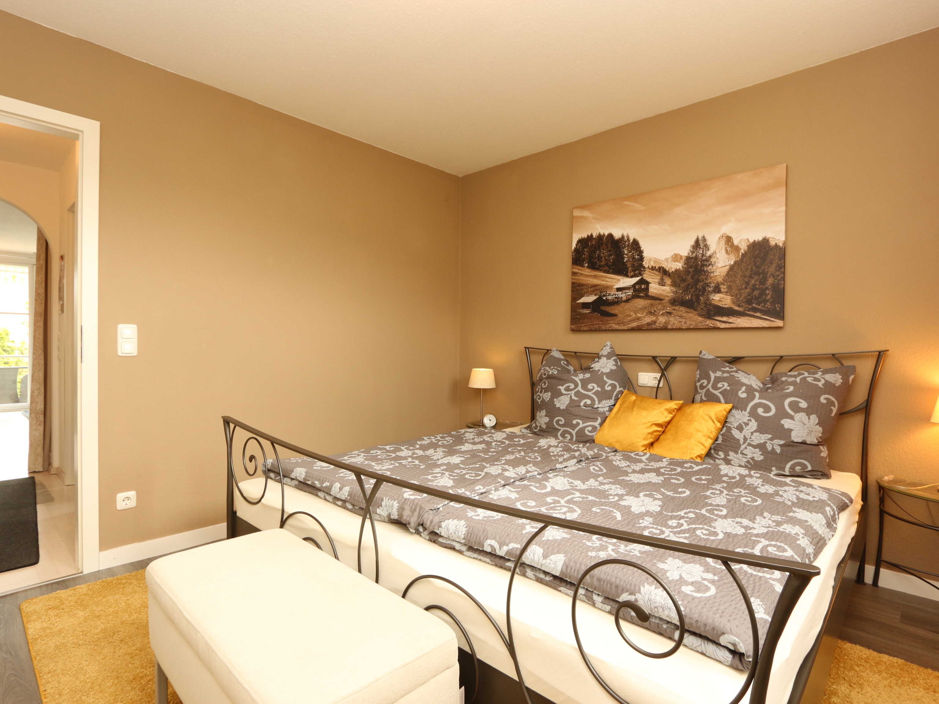 • Schlafzimmer mit Doppelbett (180 x 200 cm) für 2 Personen, großer Einbauschrank, Flachbildfernseher und DVD-Player.