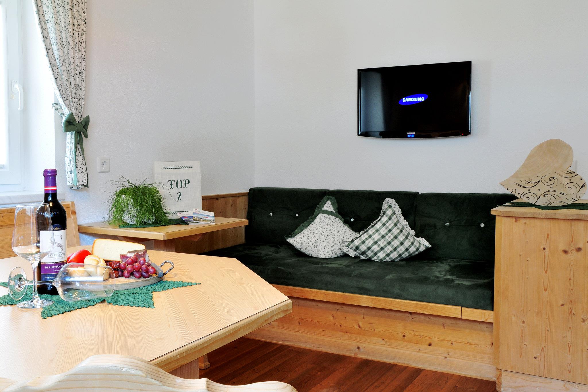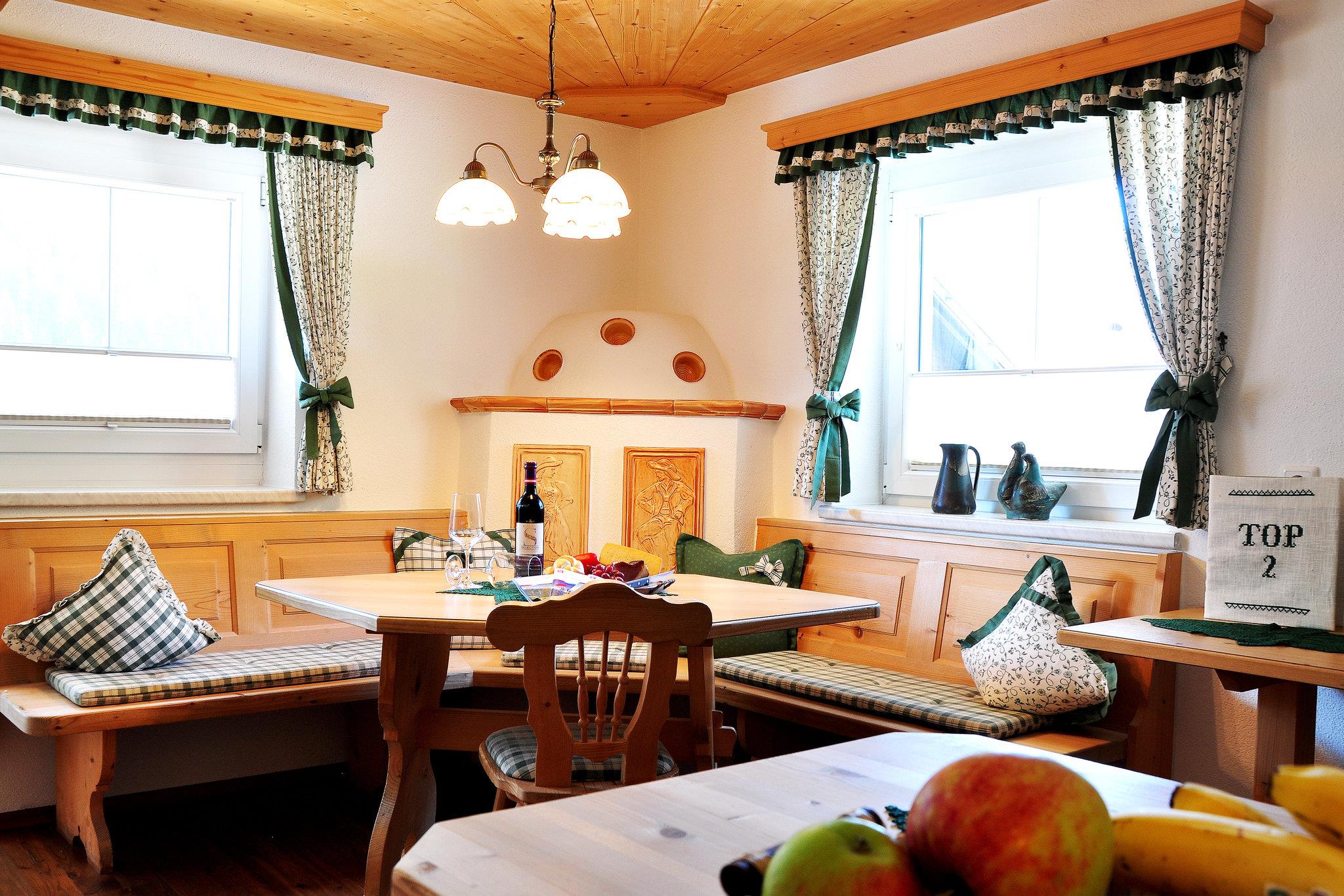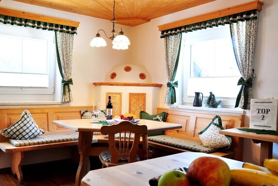 Wohnküche mit Geschirrspüler, Mikrowelle, Kühlschrank, Toaster, Eierkocher, Kaffeemaschine, Wasserkocher. Im Wohnbereich sorgt der Kachelofen mit dem Sitz- & Essbereich für besondere Wohlfühlmomente. Wohnbereich mit zusätzlichem Sofa, Sat-TV mit Radio und Balkon.
